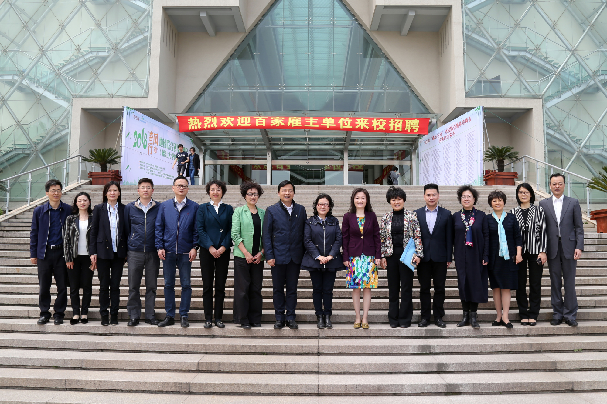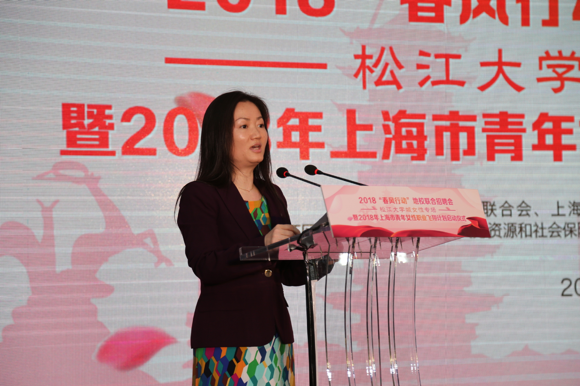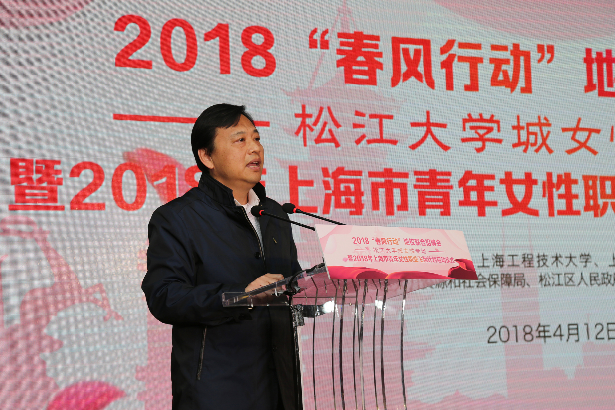 为进一步推进地校共享共建,协同促进大学生就业,更好发挥妇女组织团结、服务和凝聚女性的作用,4月12日中午,2018年乐业上海“春风行动”地校联合春季招聘会(女性专场)暨2018年上海市青年女性职业飞翔计划启动仪式在我校松江校区图文信息中心第二报告厅举行。上海市妇联副主席黎荣,松江区副区长龙婉丽,校党委副书记、工会主席史健勇,上海市就业促进中心副主任沈浩,上海市教育系统妇工委副主任、上海市教育工会女工部部长彭超波出席会议,上海市妇女干部学校、松江大学城服务中心、区妇联、区人社局、广富林街道分管领导,松江区各街道妇女干部、大学城各高校工会、妇工委/妇委会负责人以及女大学生代表与会。