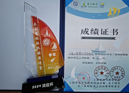 11月17日,2024年长三角校际帆船联赛在上海东方绿舟举行,我校勇夺季军。2024东方舟杯长三角校际帆船联赛由上海市高等教育学会主办,上海市青少年活动营地东方绿舟联合主办。上海工程技术大学腾飞帆船队由体育部主任张建新担任领队,体育部教师王彦收担任教练。苏占鳌、马天傲、韩家祥、马博涵四名学生作为队员共同参与了本次比赛。