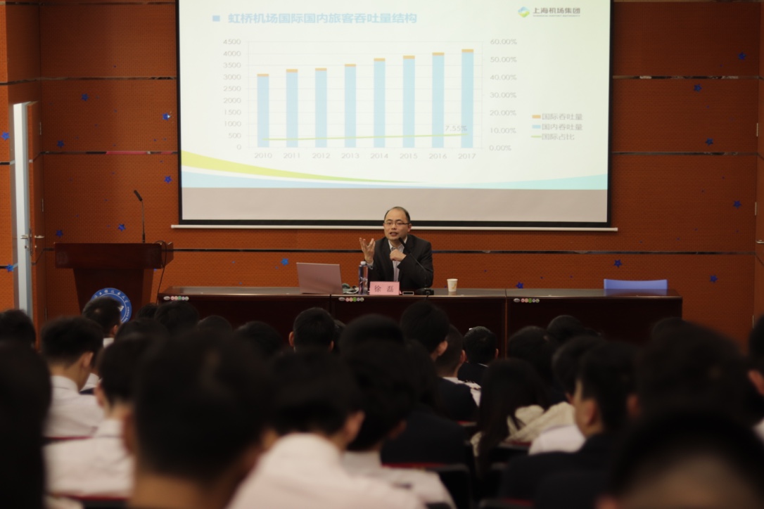 讲堂伊始,戴振华副书记首先对徐磊主席的到来表示热烈欢迎,向与会师生介绍了徐磊主席的简况。随后徐磊主席作为主讲人,从上海机场总体情况、浦东机场班组长协会概况、个人工作体会与成长感悟等三个方面入手,结合新时代民航发展对青年成才的要求,做了一场生动有趣的讲座。徐磊主席从上海两座机场的运输规模、航线网络现状、航空公司运营发展态势等多维度详细介绍了近年来中国民航特别是上海机场的发展情况,展现了上海机场在航线网络通达性、航空公司运营管理、货邮运输规模等具备的竞争优势,使现场的师生感受到了现代民航的魅力。