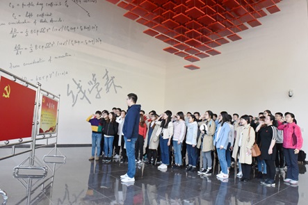 在图书馆序厅,在4015页“钱学森手稿”组合而成的倒三角艺术装置“升腾的智慧”下,背对着印有放大的手稿和签名,全体毕业生党员在党旗前右手紧握拳头,满脸庄严重温入党誓词,再次接受党性教育和爱国主义的红色洗礼。