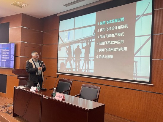 曹喜锋结合自己多年来开展民用飞机设计研发制造的经验,通过大量的专业图解和生动案例,讲述了民用飞机发展的历史,设计和适航、生产模式、软件应用、回收利用等方面的基本知识,加深了党员干部和师生对区域经济的理解,拓展了大家的国际视野,增强了大家的职业意识、安全意识、环境意识和爱国热情。