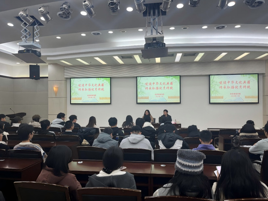 为弘扬中华优秀传统文化,以经典文化浸润青年成长,11月29日,纺织服装学院“悦读中华文化典籍,传承弘扬优秀传统”系列活动之传统文化大讲堂第二讲在图文信息中心第三报告厅正式开讲。讲座由纺织服装学院党委副书记谢志霞主持,全体传统文化研修班学员、学院青年学生代表等到场聆听。