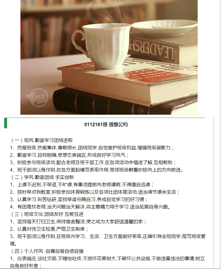 各班级提交的班级公约内容详实,均能够彰显各班专业特色,体现了当代青年人的历史责任担当和积极向上的青年态度,集中体现了社会主义核心价值观。学院从各班的班级公约中择优选择在学院官方微信上进行展示,希望在学院内形成“风清气正 ,奋发有为” 的班风氛围, 打造积极向上的班级文化作为班级的精神营养,深深植根于学生心田。希望同学们能够在班级公约的指导下,不忘初心,砥砺前行!