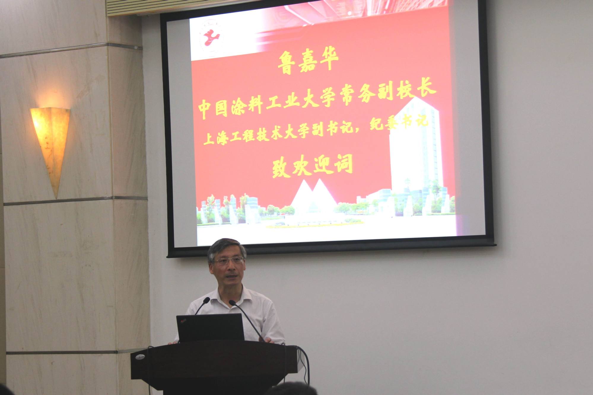 上海工程技术大学党委副书记、纪委书记,中国涂料工业大学常务副校长鲁嘉华教授致欢迎词,他介绍了我校发展历史,办学定位,办学特色,重点讲述了涂料工程专业建设背景和发展过程,感谢涂料专家对中国涂料工业大学的建设给与的指导和帮助。会上,鲁嘉华副书记宣布校聘涂料兼职教授名单并颁发聘书。