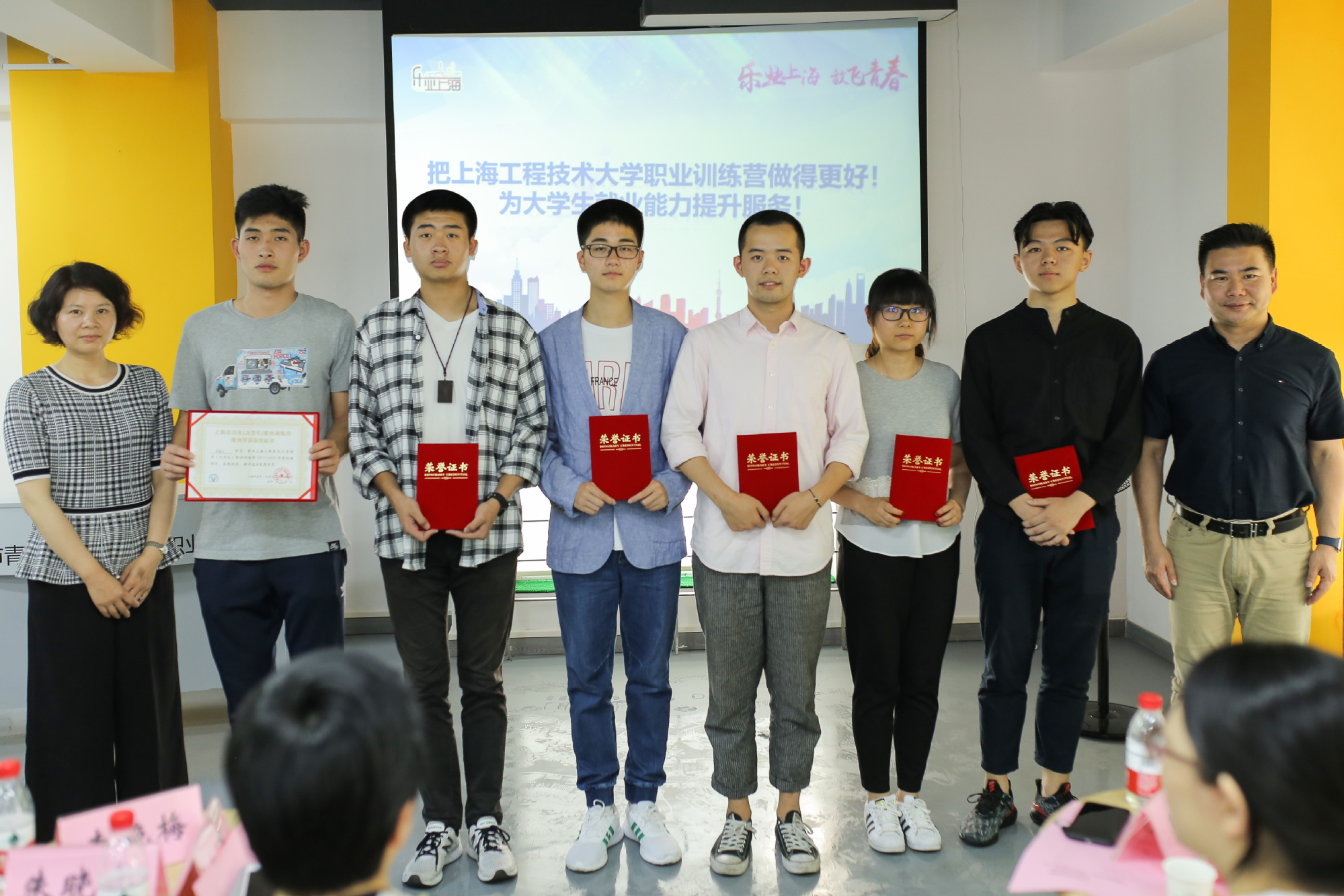 会上,上海鑫湛教育科技有限公司副总经理陈越介绍了职业训练营开营以来的运营情况,自2017年9月开营以来,训练营面向广大学生开设了就业综合素质训练项目、交通运输服务职业技能训练项目和服装智能定制职业技能训练项目,共有1500余名大学生从中受益,特别是针对家庭经济困难学生开展了一对一职业能力帮扶与指导。我校3名优秀学员代表全体参训学生上台发言,分享了各自的参训经历和感想。18名优秀学员荣获《职业训练营优秀学员证书》,并由上海市三享两益青年发展中心理事长赵伟现场发放《企业实习offer直通车证书》。