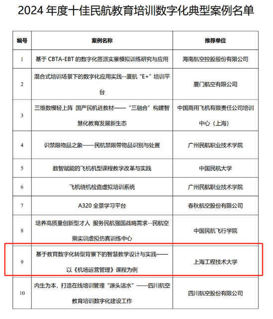 近日,民航行业教育教学指导委员会发布“2024年度十佳民航教育培训数字化典型案例名单”,航空运输学院周慧艳老师牵头的 “基于教育数字化转型背景下的智慧教学设计与实践——以《机场运营管理》课程为例”项目获评为十佳典型案例。