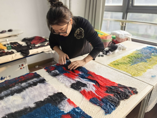 羊毛毡是一种采用羊毛制作而成的古老织品形式,具有悠久的历史和丰富的文化背景,其色彩斑斓、温柔细腻的特点也深受广大手工艺人的喜爱。本次活动邀请到了那山制造品牌创始人、纤维艺术家孙怡平。孙老师从实际案例出发给大家分享了羊毛毡围巾的制作手法和注意事项,并且进行了现场演示,老师们跃跃欲试,迫不及待开始了自己的创作。