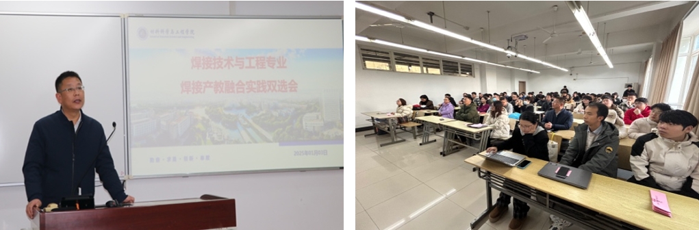 1月3日,材料科学与工程学院举办了焊接产教融合实践双选会。学院党委副书记、院长李军,副书记刘倩,焊接技术与工程系主任张天理、学工组长石玉枝,来自10家企业的招聘团队、教师代表和2022级焊接技术与工程专业本科生等约80余人参加活动。