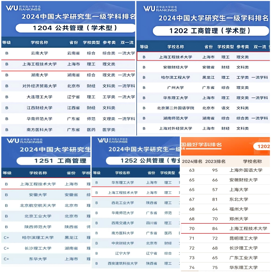 管理学院加强经管学科特色建设,服务地方经济与社会发展,不断提升学院的知名度和影响力。2024年在武书连学科评估中,工商管理学、公共管理学、MBA和MPA排在全国前50位次。软科中国最好学科排名中,工商管理学进入25%,较2023年进步14名,排在全国70位,学科建设水平快速提升。成功获批工程管理(MEM)学位点,在上海申请MEM的5所学校中排名第1。成功签约全球工商管理博士(DBA)项目,与俄罗斯联邦总统国民经济和国务学院联合培养,2025年将面向全国招生。获批国家级课题10项,其中社科重大项目子课题1项,国家社科重点1项,国家社科一般7项,国家自科青年1项(转入)。获批数、获批率和质量均创历史新高,获批数量名列全国高校商学院前列。学院聚焦产业发展与科技创新、健康中国与养老政策、旅游与城市合作等,完成二类以上论文36篇,获国务院领导批示3项、省部级领导批示7项,被国办内参采用16篇、教育部、《专家反映》等采用9篇。举办了全国经管期刊创新发展论坛(2024)、ACIEK(Winter)-IMIP2024国际经管期刊论坛、“社会保障前沿问题”国际高峰论坛暨第十五届上海市研究生学术论坛、2024中国邮轮经济发展高峰论坛等高水平学术会议。
