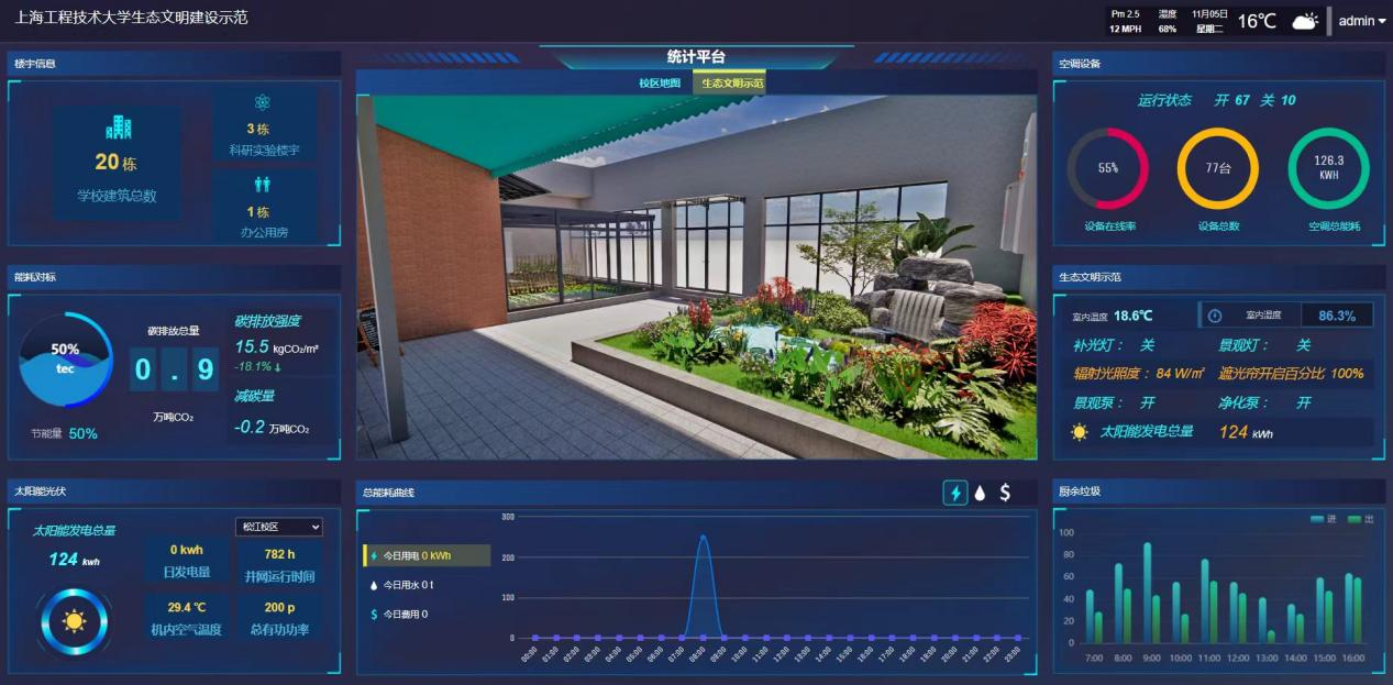 践行生态文明教育。获批教委生态文明示范学校建设项目,整合光伏发电、雨水回收、湿垃圾处理利用装置,建设“零碳”绿色生态微场景。上线微场景节能、节水实时动态数据展示平台,打造生态文明育人平台。与上工程泗泾附校在“初心苗圃”联动开展大中小劳动一体化植树节活动。与各学院联动开展湿垃圾资源化现场教学、护树涂白·情暖程园等活动,深化师生生态文明意识。