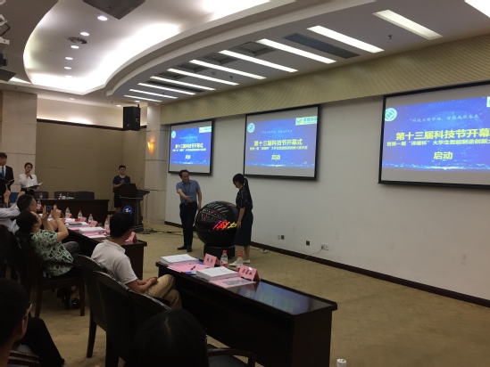 接着,方院长与上海泽耀环保科技有限公司总经理张志兰女士一起触摸启动球,启动第十三届科技节暨第一届“泽耀杯”上海工程技术大学大学生智能制造创新大赛决赛。随后第一届“泽耀杯”上海工程技术大学大学生智能制造创新大赛决赛开始,此次泽耀杯大学生智能制造创新大赛决赛是科技节的竞赛部分,由上海泽耀环保科技有限公司赞助支持,比赛开赛以来,参与度火爆,收到参赛作品科技感十足,其中包括了机器人、无人机、3D打印、无人驾驶、虚拟现实、智能物流、节能环保等。经过初审函评,有15支队伍来到现场。决赛现场每队将准备5~8分钟左右的作品陈述,力求在较短时间内说明主题,展示创新点及其意义,对其效果做先期预想。评审专家共同对作品进行打分,评选颁奖。经过接近三个小时的精彩展示与,15支团队逐个进行作品展示,对各位评审专家的问题逐一认真回应。评审专家根据作品书与团队现场展示进行打分,评选出一等奖1队,二等奖4队,三等奖5队,优胜奖5队。