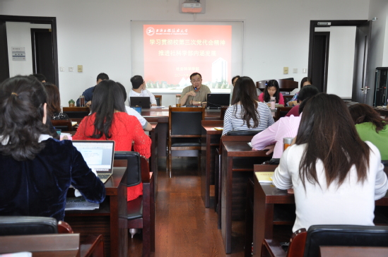 6月1日上午,社会科学学部党总支在行政楼812会议室召集学院教师代表集中学习了学校第三次党代会精神,社会科学学部党政领导和全体教师参加了此次学习会。