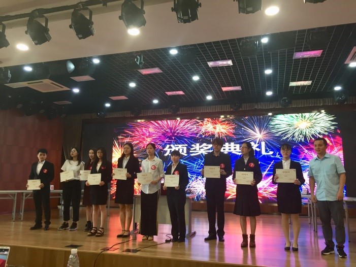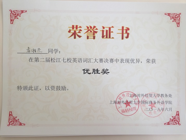 6月1日下午,在我校外国语学院大学外语教学部蒙晓虹老师带领并指导下,由秦湘杰同学和杨琰同学(均来自轨道学院)组成的竞赛团队前往上海对外经贸大学参加由其主办的第二届松江七校大学生英语词汇大赛,经努力,取得了优胜奖的好成绩。本次比赛是松江七所高校的校际竞赛,由上海对外经贸大学国际商务外语学院大学英语教学部和学院团委承办,旨在促进松江各高校之间英语学习交流,并提升同学们对英语语言基本功之一---词汇的重视。本次比赛出题范围主要为大学英语四、六级词汇表(为凸显区分度,适当包含超纲词汇)。松江大学城七所高校---东华大学、上海外国语大学、上海工程技术大学、华东政法学院、上海立信会计金融学院、上海视觉艺术学院和上海对外经贸大学分别派出了非英语专业的高水平选手代表本校参加比赛。比赛分三轮进行。第一轮是句子填词,看英语释义填出所空的单词。第二轮是看图猜词,根据图片以及中文提示和首字母,说出正确的单词。第三轮是汉英译词,根据中文意思和首字母提示,答出所需单词。秦湘杰和杨琰同学冷静沉着,机智应对,经过激烈地角逐,最终获得优胜奖。