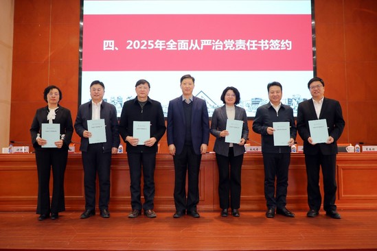 会上,学校举行了全面从严治党责任书签约仪式。校领导正职与校领导副职、全体校领导与机关部处长及学院党政主要负责人代表,分别签约并颁发了2025年学校全面从严治党责任书。