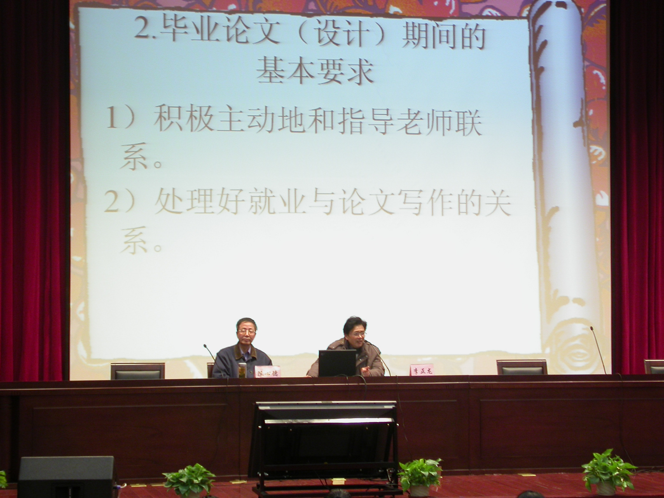 学院教学副院长李正龙就毕业设计各个环节对毕业生提出了基本要求,本院资深教师陈心德利用多媒体课件,为毕业生详细地讲述了撰写毕业论文的目的、写作规范、论文考核流程、每周进度、资料收集、研究方法等。 岳燕 | |