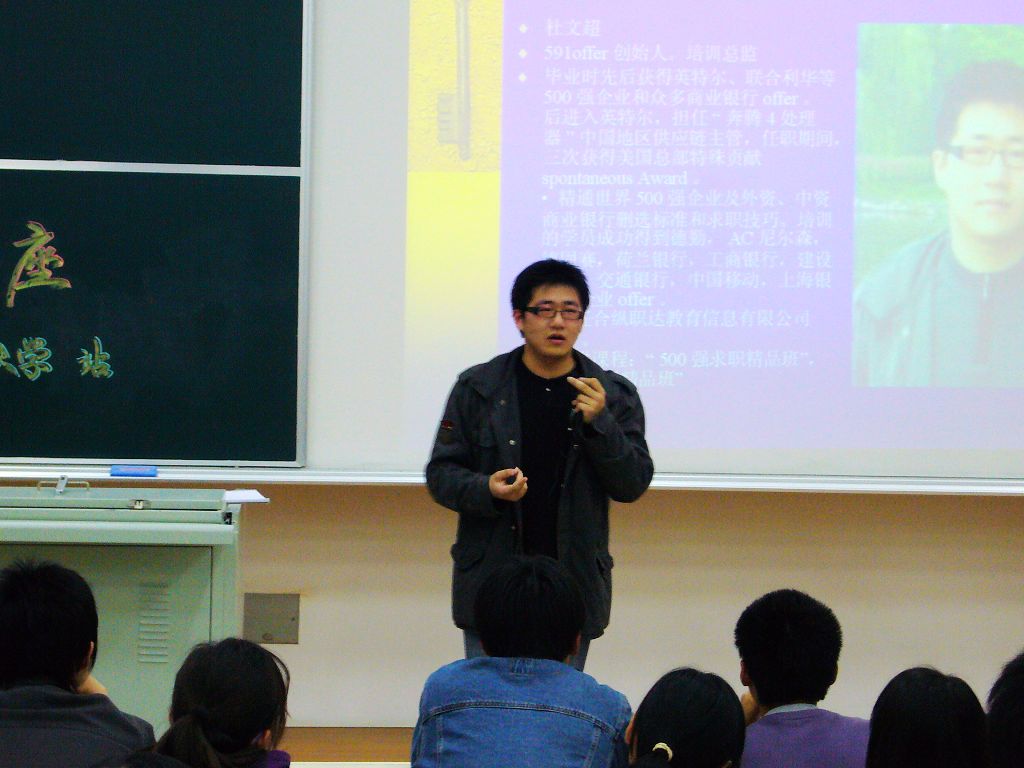 此次讲座邀请到了59offer网站创始人、培训总监,现任合纵职达教育信息有限公司CEO杜文超,以及易友俱乐部创始人石磊担任主讲。两位都是刚刚毕业不久,他们分别以自身丰富的创业经历,讲述了创业的辛酸苦辣,“8+8+8小时工作”,star法则等新概念让在场同学对创业有了一个新的认识。 | |