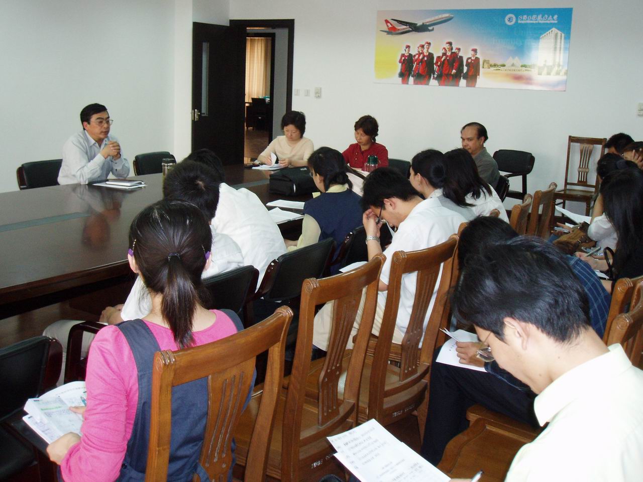 5月18日下午两点,航空运输学院全体教职工集中在学院会议室,由学院党总支书记、工会主席卫国林传达沪工程委[2007]2号《关于向方永刚同志学习的通知》的文件精神。 卫书记指出,全院教师要以学习方永刚同志先进事迹为契机,深化教师队伍的素质建设,在平时的教学工作中严格要求自身,争做为人师表的楷模。全院教师积极响应号召,纷纷表示将会以方永刚同志为学习榜样,把学习成果真正落到实处。 航空运输学院 | |
