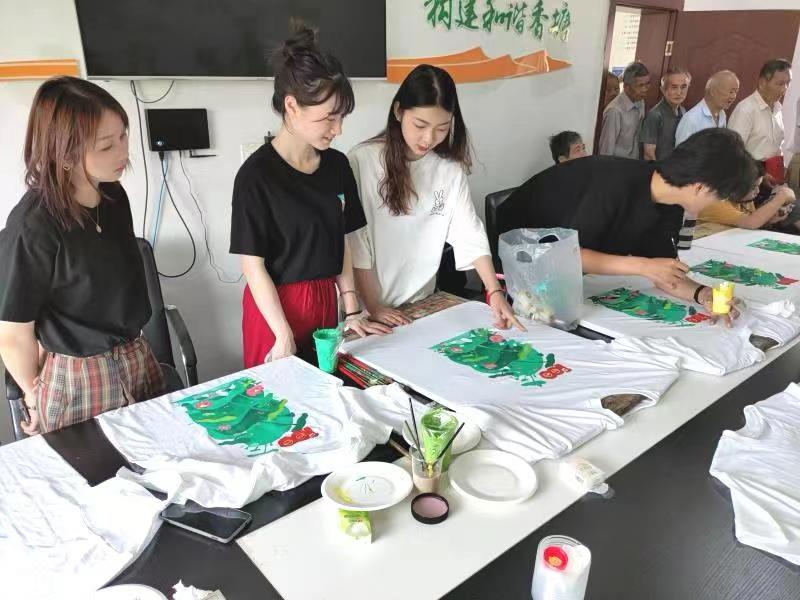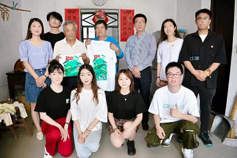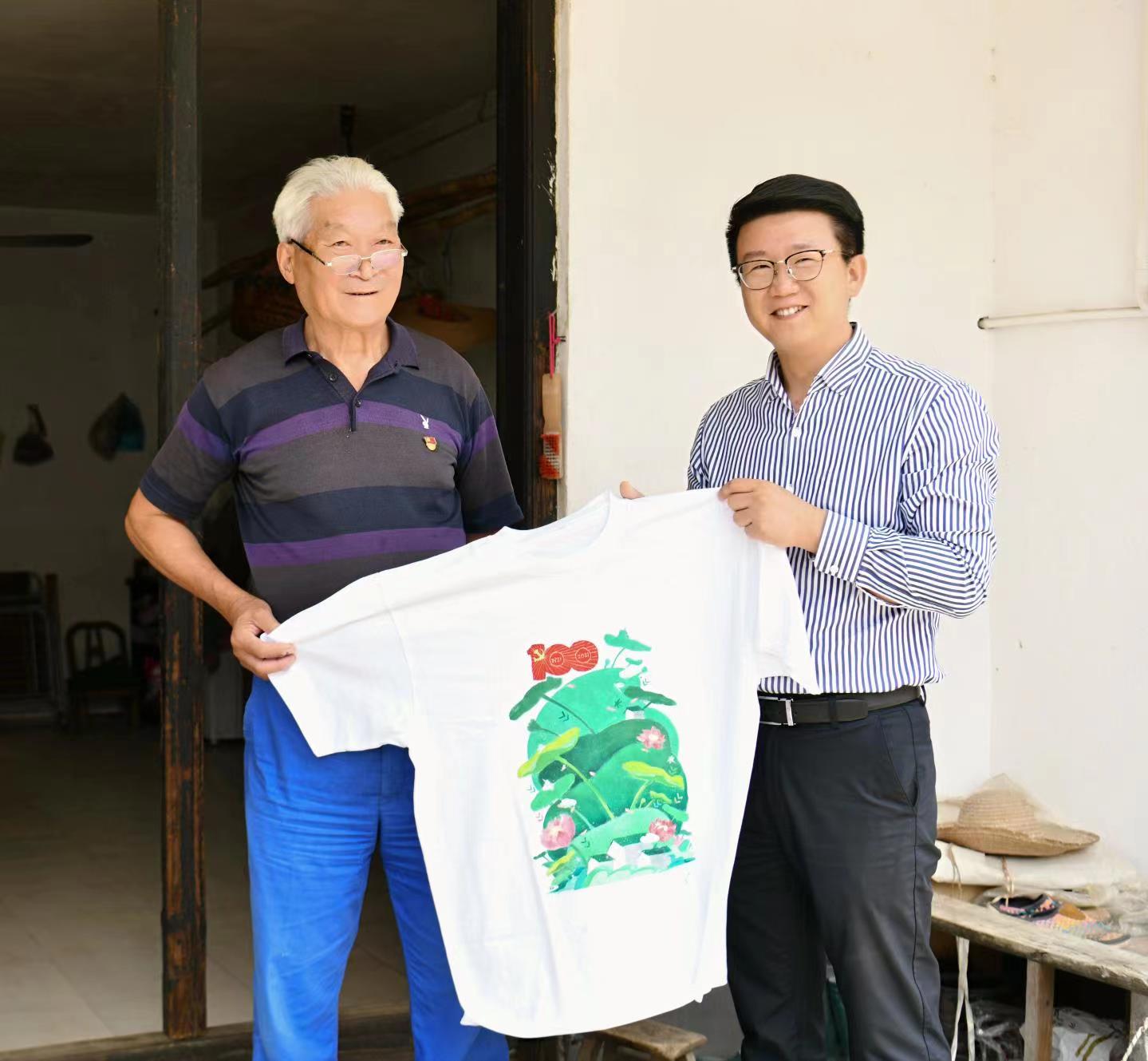 艺术设计学院党委高度重视这次“微行动”,在此之前组织支部学生党员前往实地考察和对接,讨论并设计具新浜荷花元素和建党百年元素的文化衫的图案纹样。当天,支部学生党员在现场开始按照设计好的图案纹样在T恤衫上绘制图案,摄影专业的学生党员则为老党员们拍摄活动纪念照。刘江老师在村支书秦春花老师带领下,还为行动不便的老同志送衣上门,赠予老党员同志留作纪念;“在这个值得纪念的历史时刻,感谢这群年轻人帮助我们实现心愿。”从学生手中接过文化衫时,老党员李兴生又惊又喜。