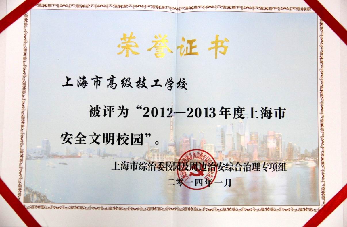 经学校自评,虹口区综治委校园及周边治安综合治理专项组检查、推荐,市综治委校园及周边治安综合治理专项组验收、审查、公示等程序,高级技校再次被授予“2012-2013年度上海市安全文明校园”称号。这是学校第五次获得此殊荣。