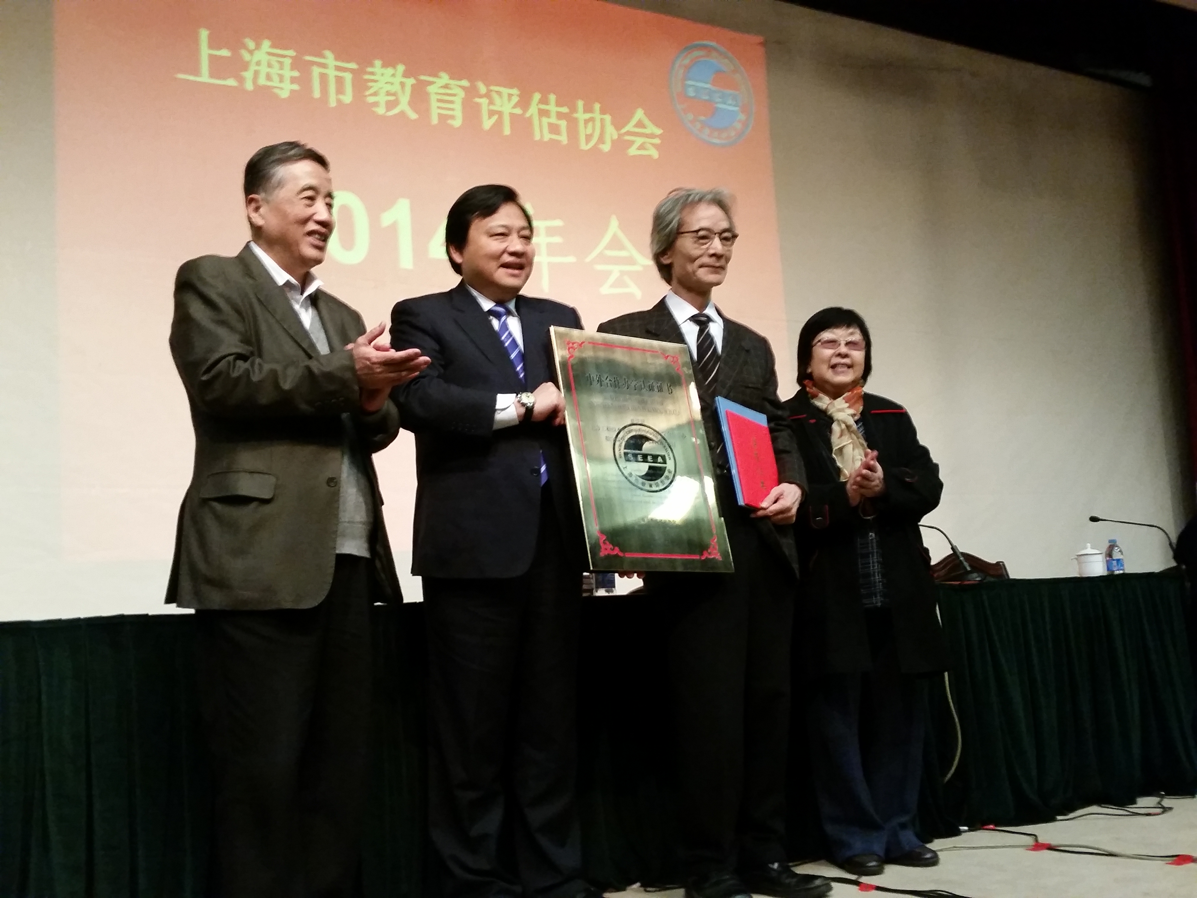 3月26日上午,史健勇副校长应邀出席了在上海开放大学召开的上海市教育评估协会2014年年会。应邀随同参加年会的还有国际交流处处长钱慧敏、中韩多媒体设计学院中方院长唐幼纯、韩方院长金锺琪等。会上,上海市教育评估协会荣誉会长郑令德女士和上海市教育评估协会会长张伟江教授为我校中韩合作办学项目通过认证举行了授牌仪式并颁发荣誉证书。史健勇副校长和中韩合作多媒体学院韩方院长金锺琪教授代表我校接受了授牌和荣誉证书。