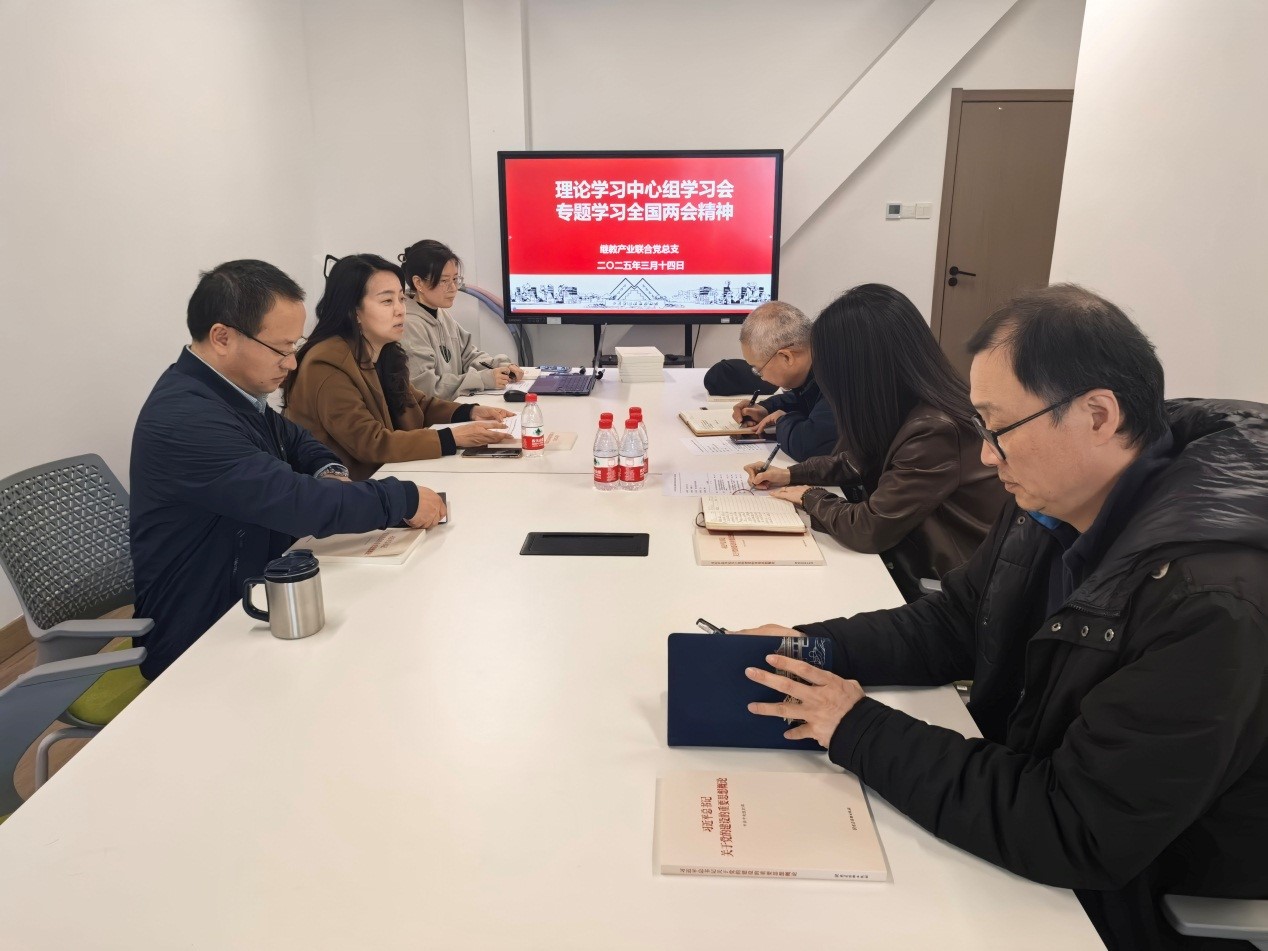 的3月14日上午,继教产业联合党总支在长宁校区产教融合大楼1101室召开理论学习中心组学习会,传达《2025年政府工作报告》,学习全国两会精神。全体党总支委员、继续教育学院班子成员参加会议,会议由继教产业联合党总支书记袁蓉主持并领学。
