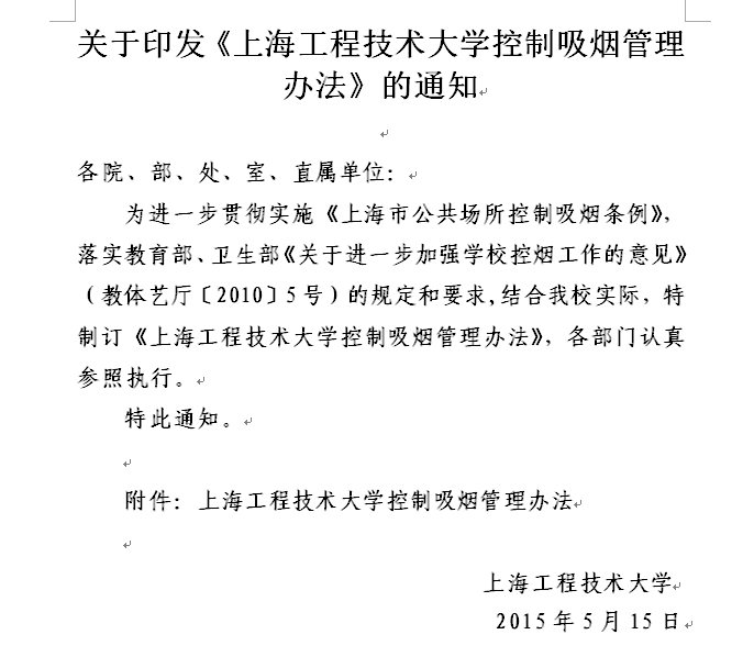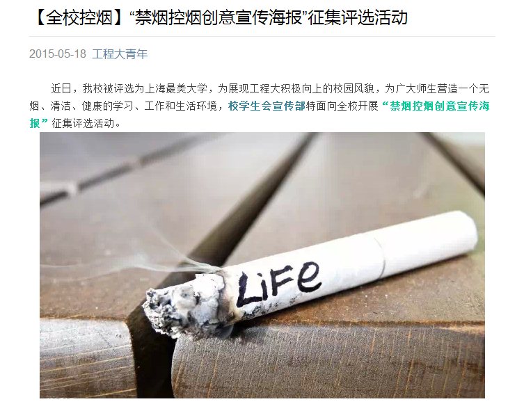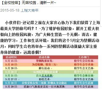 5月31日是世界卫生组织发起的第28个世界无烟日,为使我们的校园更加文明而美好,有利于教师和学生的健康生活,学校以此为契机全面开展了“创建无烟校园”活动,校文明办于5月初在学校公告上发布了《控烟倡议书》,要求在教学楼、办公楼、宿舍、图书馆、实验室和食堂等公共场合内禁止吸烟,打响了校园控烟的第一枪。