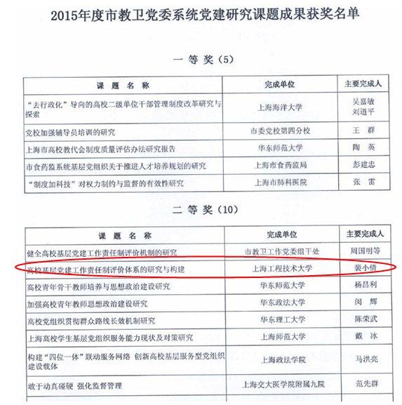 为进一步推进党建研究工作,以党建研究推动党建工作科学化水平,教卫党委系统党建研究会于2014年确立了158个立项课题,经专家初评、复评和终评,共评选出一等奖5项,二等奖10项,三等奖25项,我校党委副书记裴小倩领衔的《高校基层党建工作责任制评价体系的研究与构建》课题获二等奖。