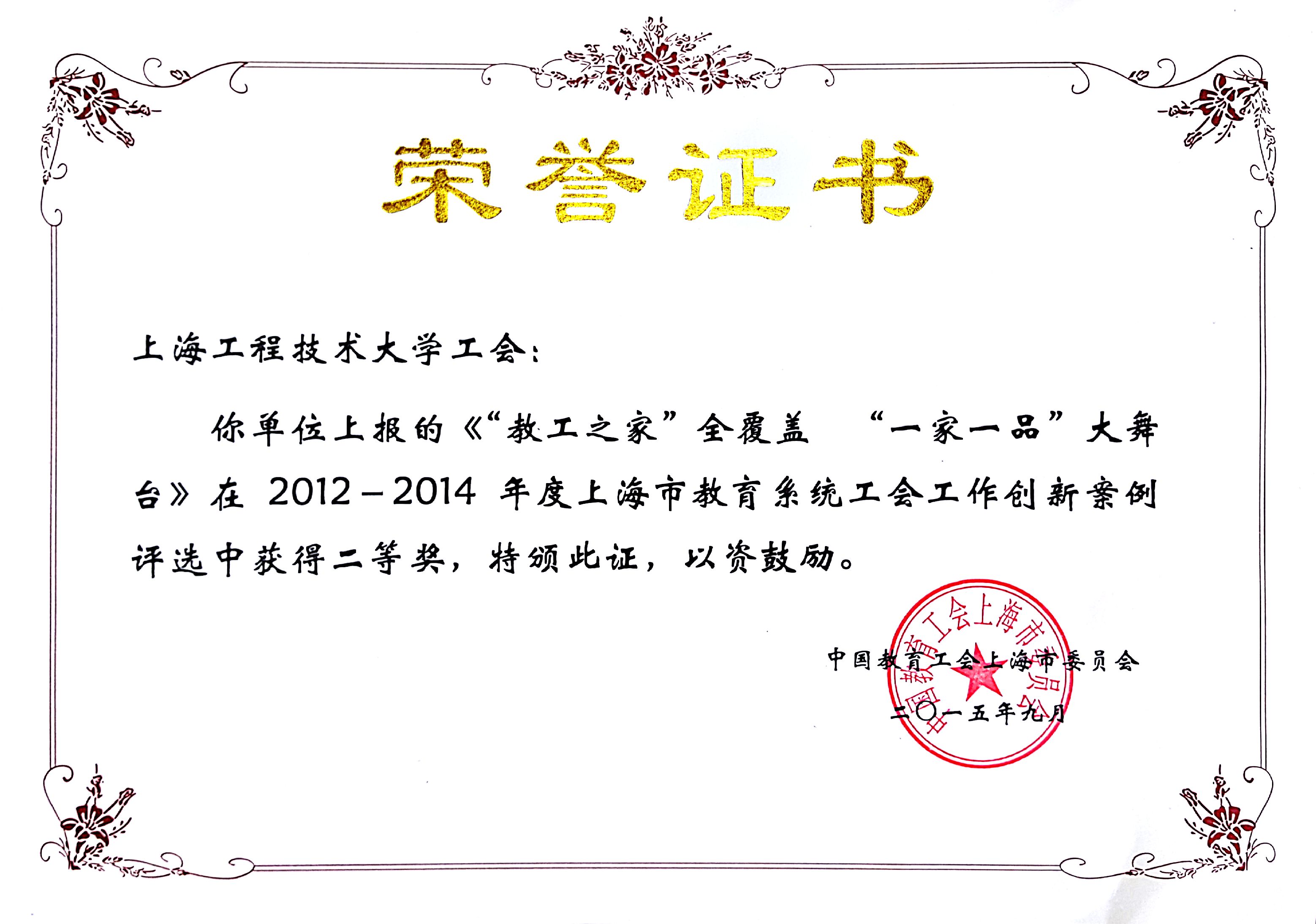 从上海市教育工会第九届委员会第五次全委(扩大)会议传来喜讯,我校工会工作模式和创新发展实例获得上级肯定,凭借上报的《“教工之家”全覆盖、“一家一品”大舞台》案例荣获2012-2014年度上海市教育系统工会工作创新案例二等奖。