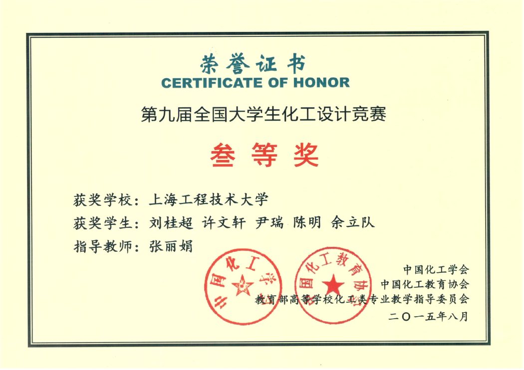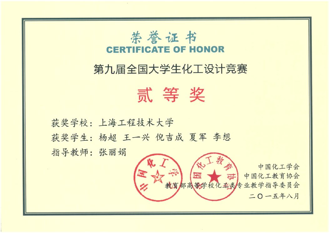近日,2015年第九届全国大学生化工设计大赛组委会公布了获奖名单,我校化学化工学院学生组成的“E.F.”和“SUES Catalyst”两支队伍,凭借出色的表现,分获二等奖和三等奖。