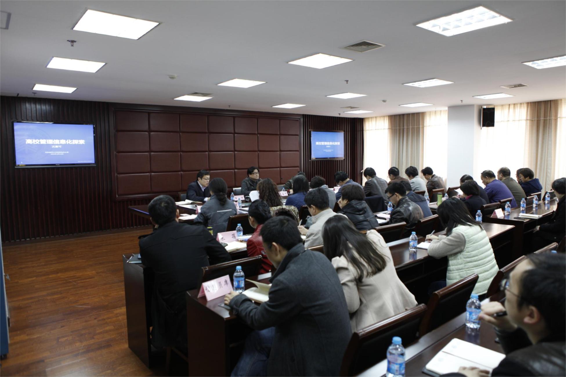 |   3月24日下午1:30,机关党委在行政楼506会议室召开服务型机关建设工作推进会。校党委副书记裴小倩,机关党委书记、党办主任王陈,机关党委副书记茅华伟出席,各机关部处负责人,各学院、部处信息员参加会议。会议由王陈主持。 为有效推进服务型机关建设,提升机关信息化服务意识和水平,会议特邀华东师范大学信息办主任沈富可教授作了主题为“高校管理信息化探索”的专题报告。沈教授从高校管理信息化应服务于大学治理的高度谈起,提出信息化应助力提升学校的管理效率,服务于学校的战略规划,发挥其在大学治理中的关键性作用。同时,他结合华东师范大学在新媒体建设、公共数据平台建设、机关一站式服务体系建设等具体案例的介绍,提出高校在推进信息化建设上需要管理与技术的配合、必备的信息管理人员以及部门间的通力协作等建设性建议。 会上,校党委副书记裴小倩指出,加强机关的信息化管理建设,旨在通过提高机关的办事效率,提升服务师生的质量和水平,各机关部处应在思想上形成共识,加强部门间的通力合作。在申报各部门信息化管理项目方面,裴书记提出了三点要求。一是要切实可行。应紧密结合各部门工作实际,在完善原有工作基础上,提高日常工作管理效率;二是要扎实推进。应从办事程序的公开、部门自转过程中的信息化效率提升、多部门间实现数据共享等三个层面逐步推进;三是要强调效果。应从是否能为学校发展、决策咨询、部门间提供数据支持和方便服务师生几个层面检验信息化成效。 同时,裴书记还就机关部处下一阶段开展学校党的群众路线教育实践活动“回头看”工作,认真落实整改方案和建章立制工作进行了总体部署。要求各部门按照“销案制”要求扎实推进。 机关党委书记、党办主任王陈针对2014年即将启动的机关处室考核工作的初步设想进行了通报,并对机关党委牵头初步拟定的《上海工程技术大学机关职能处室考核办法》(讨论稿)中的考核内容作了详细解读,广泛听取部处长意见。 | |