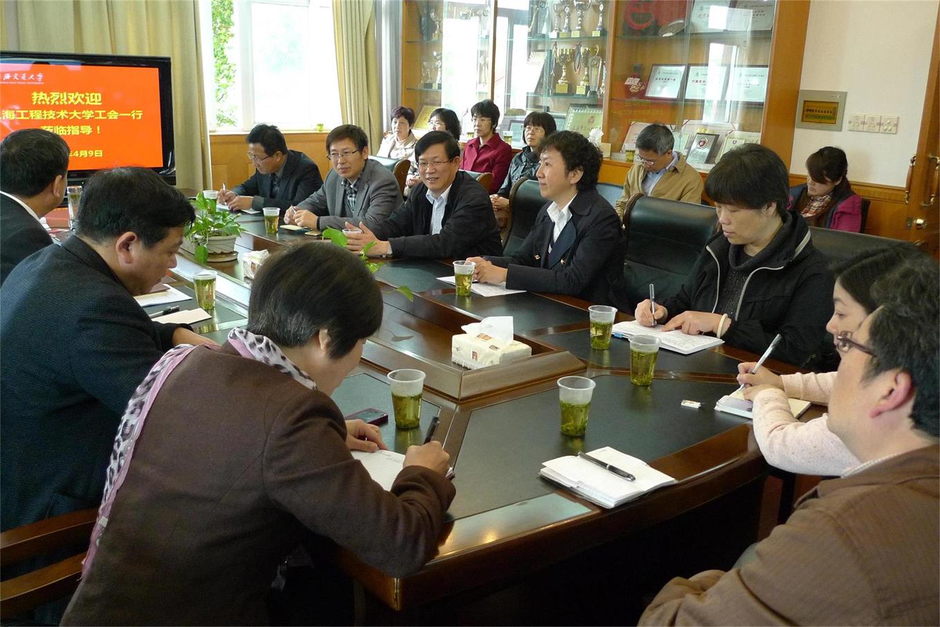 为了进一步拓展思路,学习知名大学工会工作特色经验和创新做法,结合校工会的工会干部培训活动,4月10日,校党委副书记田信灿带队,在校工会常务副主席沈海庆、副主席黄润才、何志琴的陪同下,带领校工会、部门工会等工会干部一行18人,赴上海交通大学学习调研,上海交通大学党委副书记张安胜热情接待了到访一行。陪同接待的有工会主席贾金平、专职副主席吴钢、张杰、兼职副主席万晓玲等工会领导,二级工会主席、女工委员和基层领导的代表等参加了调研。