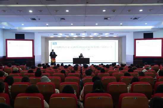 3月28日下午,深入推进新时代新征程全面从严管团治团专题报告会在图文信息中心第二报告厅举行。团市委组织部副部长赵丹丹出席会议并导学《中国共产主义青年团纪律处分条例(试行)》。校团委书记陈翼然主持会议,校院两级团干部、团支部书记代表、团员青年代表近300人参会。