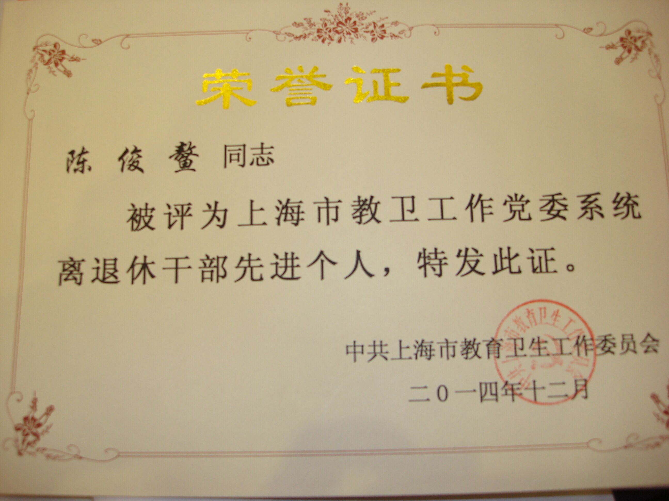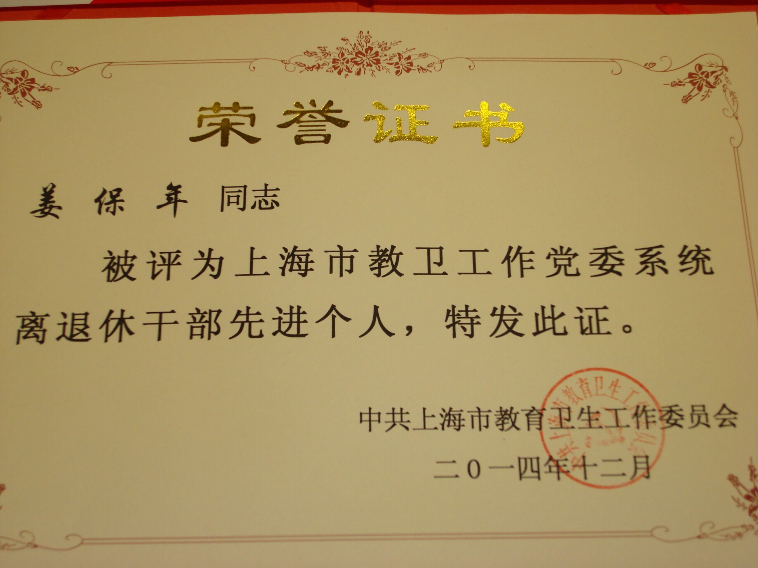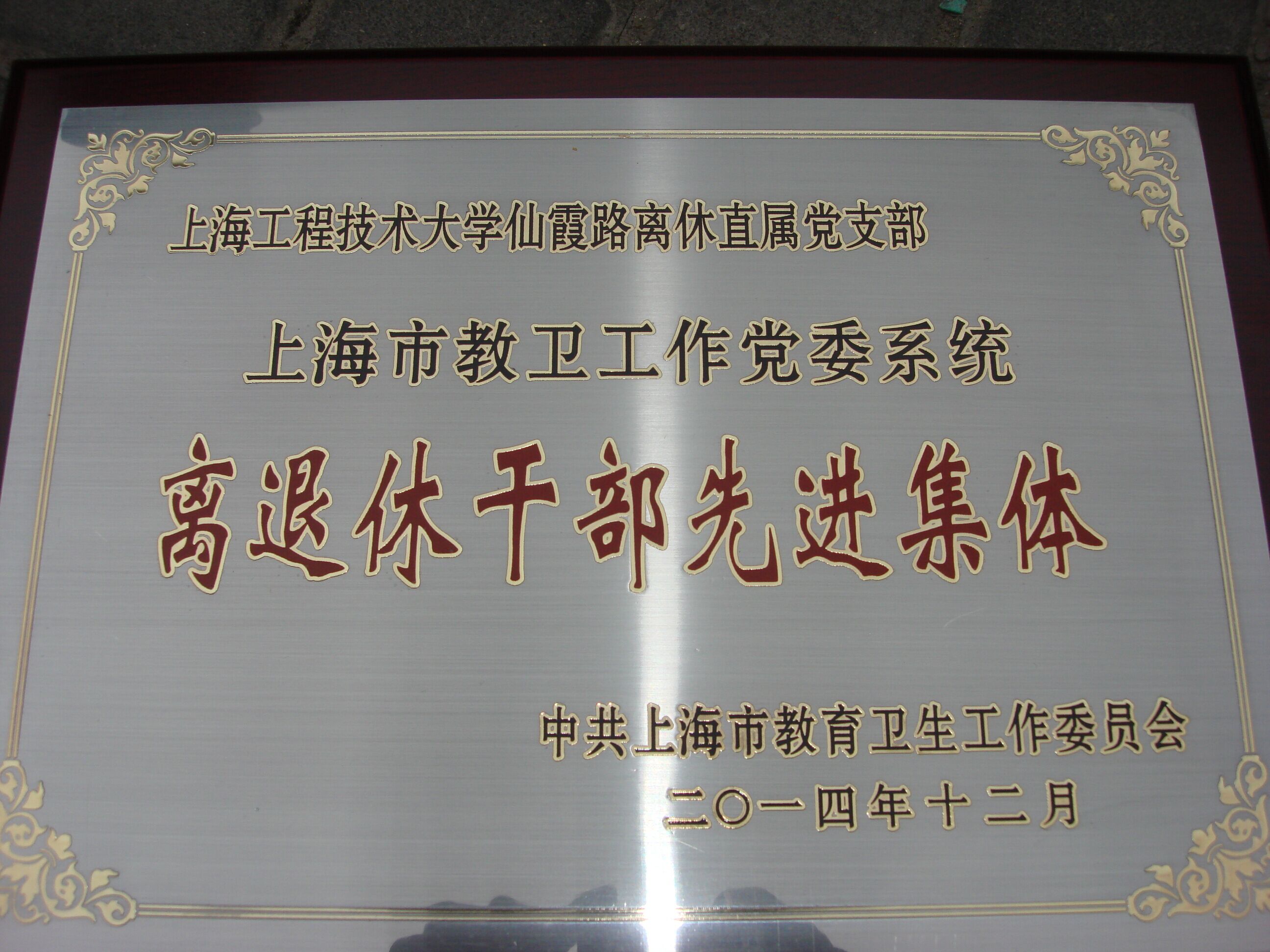 我校仙霞路离休直属党支部荣获上海市教育卫生工作党委《离退休干部先进集体》称号;离休干部姜保年同志荣获中共上海市委老干部局及上海市教育卫生工作党委《离退休干部先进个人》称号;离休干部陈俊鳌同志荣获上海市教育卫生工作党委《离退休干部先进个人》称号。