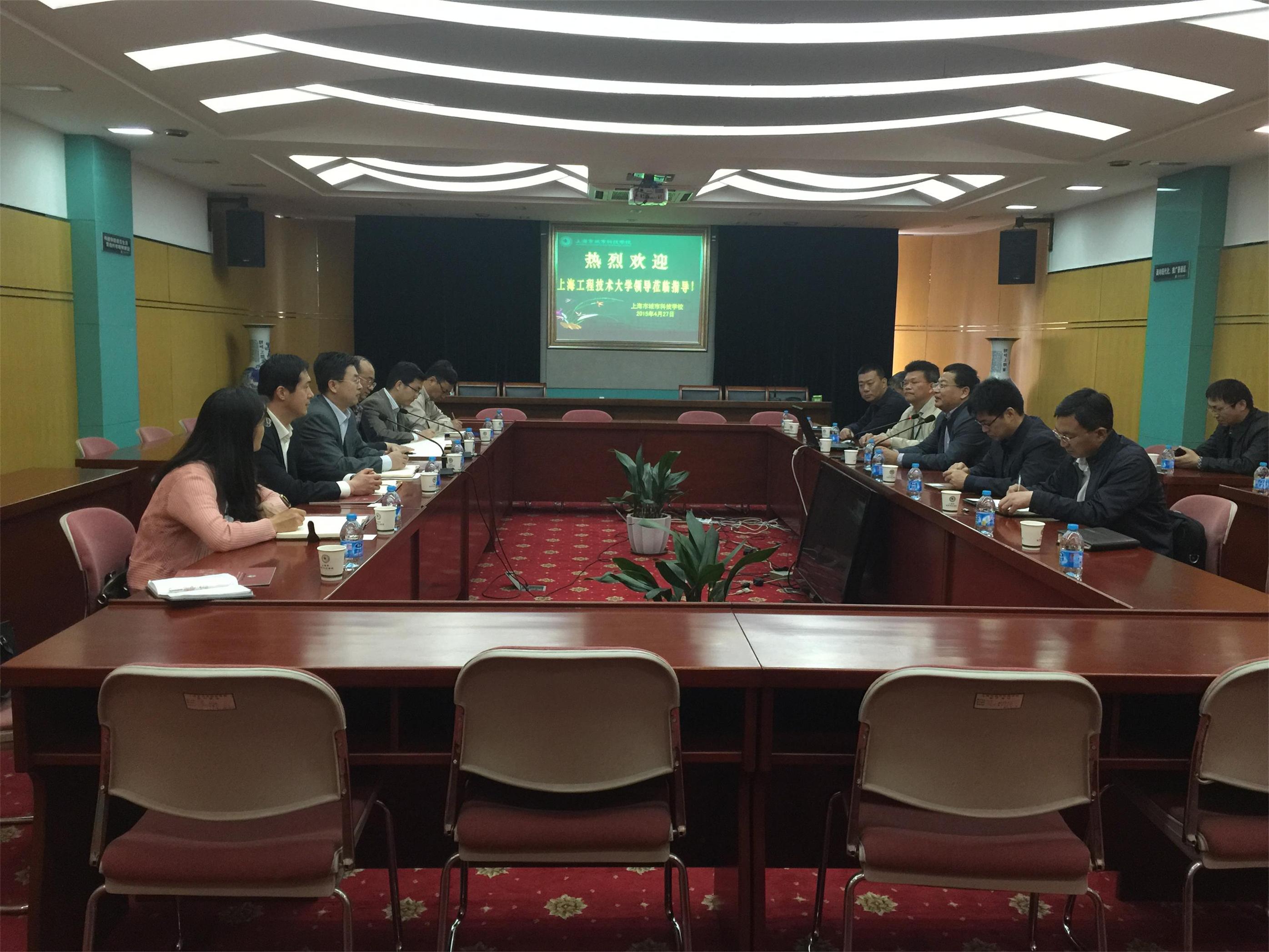 在会议室,徐届生书记首先欢迎工程大汽车工程学院领导莅临指导,希望工程大能够利用应用型大学的特色与上海市城市科技学校实现贯通发展,带动松江区的教育发展,使高校与地方深度融合,实现区校合作。张巨浪校长介绍了学校的概况,学校现有汽车工程系,目前拥有四大专门化的培养方向,希望与工程大有深度的合作,实现“中本贯通”,使得学校从技能谋生型向专业特长型发展。随后,王岩松院长介绍了工程大汽车工程学院的专业结构,分析了各个专业的特色以及适合贯通的专业,也希望双方利用已有的资源,制定出详细的实施方案,实现课程的一体化设计。