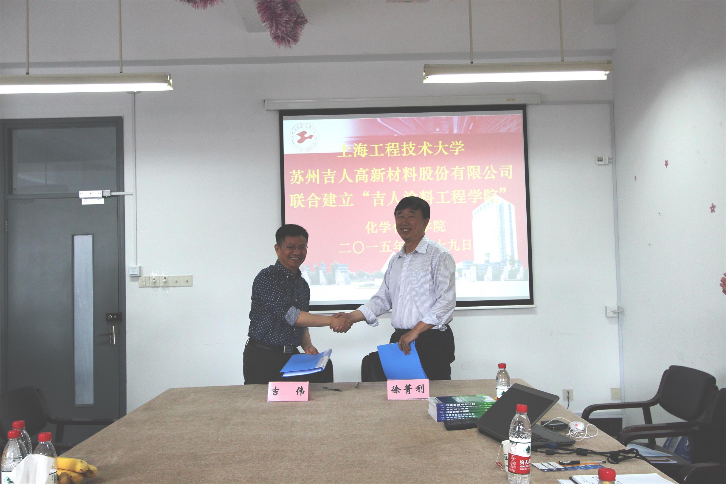 徐菁利院长介绍了学院发展的历史,师资队伍,学科建设、教学工作和研发平台。温绍国教授介绍了学院教育部批准的涂料工程专业卓越工程师人才培养计划发展的重要时间节点,人才培养模式,未来发展趋势等内容。苏州吉人新材料股份有限公司董事长吉伟介绍了企业发展情况,产品结构,全国分厂和营销布局等内容。双方就建立“吉人涂料工程学院”,设立“吉人涂料技术研发中心”,学生实习就业,教师进修,企业人才定向培养,“吉人奖学金”等内容进行了深入的交流,双方达成合作意向,草签了合作框架协议。