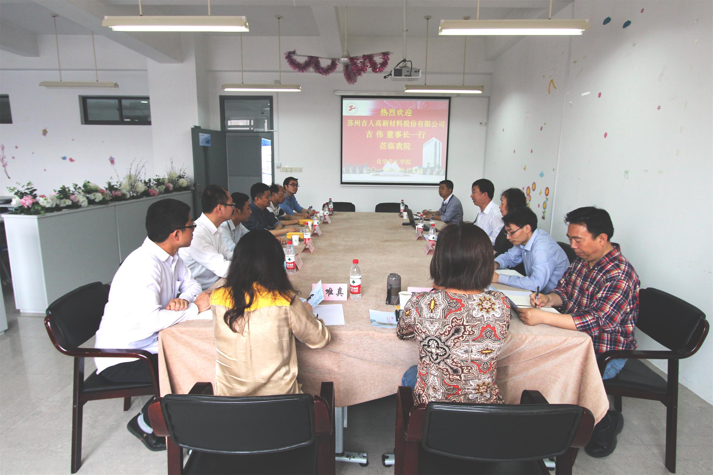 5月19日,苏州吉人新材料股份有限公司董事长吉伟,副总经理徐泽孝,技术总监张鑫,董事长秘书刘长青,商学院院长孔德斌一行五人来访化学化工学院,总支书记刘宇虹,院长徐菁利,副院长饶品华,高分子材料与工程系全体教师参加了会谈。