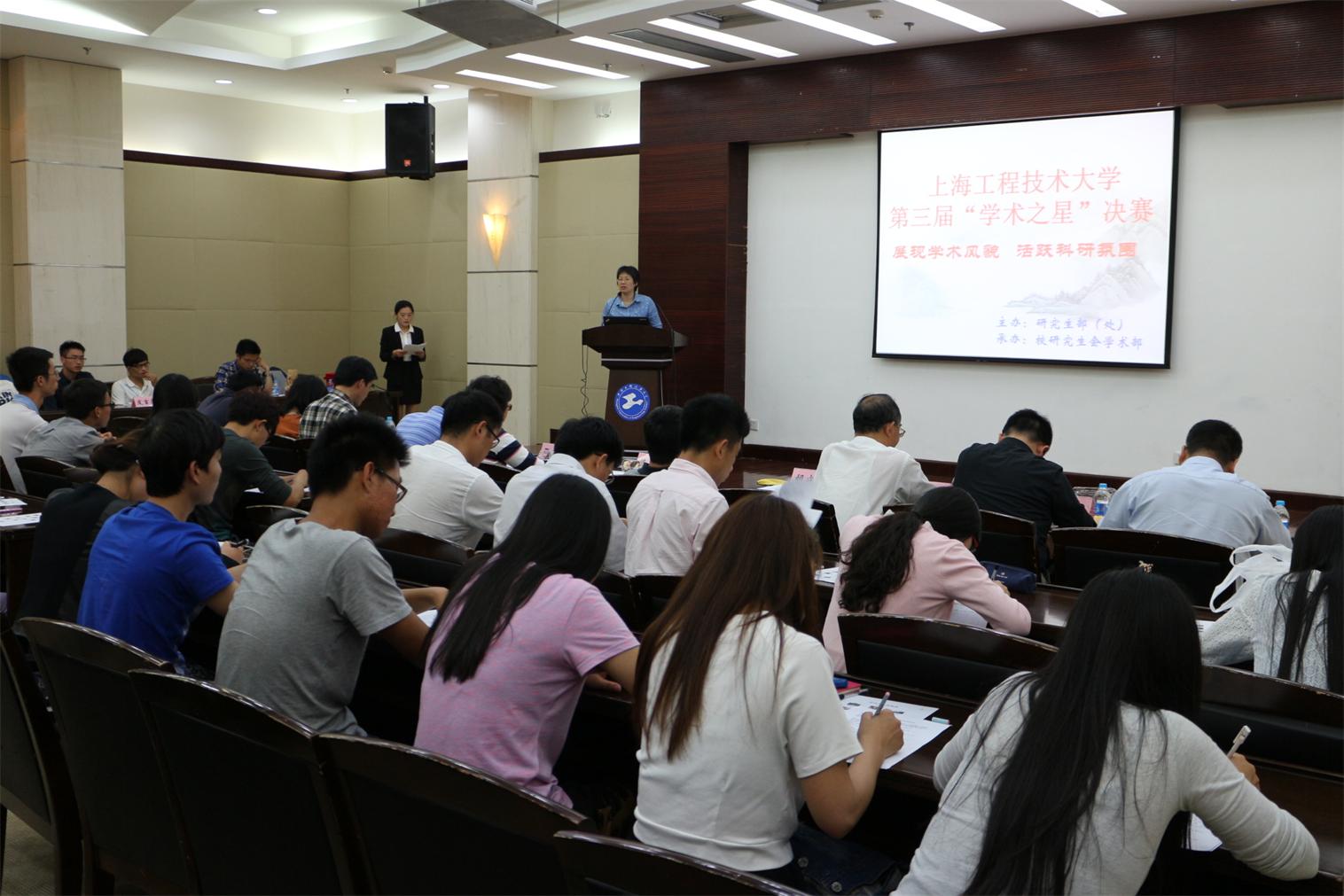首先,研究生处处长陈凌珊向参加活动的人员简要介绍了活动举办的目的,为了响应国家建设创新型国家和上海市建设具有全球影响力的科创中心,学校高度重视研究生创新能力的培养,通过学术之星评选,树立创新典型,传递榜样力量,带动学校研究生科研创新。接下来,研究生处思政与综合管理科科长王成涛汇报了第三届研究生学术之星评选活动的主要工作:评选活动自4月22日以微信线上“寻找我们身边的学术之星”为标志正式拉开帷幕,然后又通过学校官网、研究生教育网、QQ群等多种渠道进行宣传,根据报名选手的学术科研、创新实践成果进行打分,根据初赛成绩共筛选出11名高年级研究生进入学术之星决赛环节,2名一年级研究生进入学术新星决赛环节。然后在微信平台、QQ群等组织了票选活动,活动不仅扩大到了本科生,而且还传递到了其他高校,截止到5月25日决赛,阅读量已经近万,形成了很大的影响力,有效推动了校园文化和学风建设。