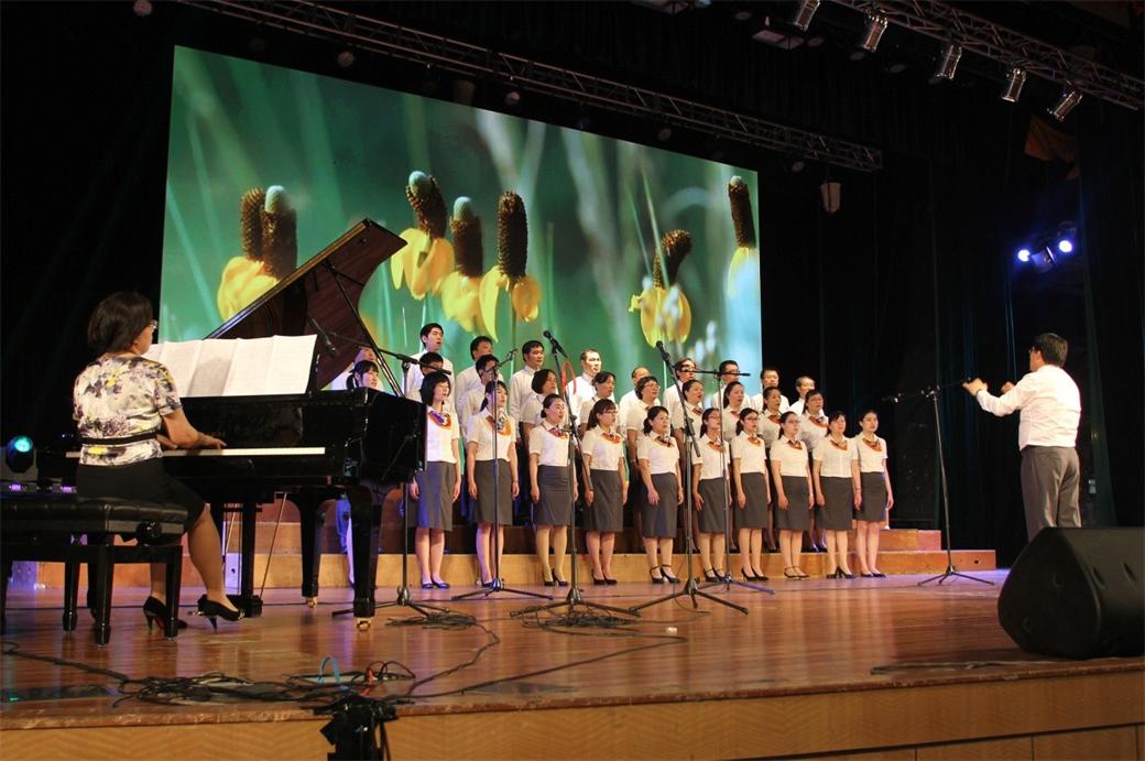 我校教工合唱队是第十二位出场的演出团队,合唱队的老师们以饱满的热情为观众送上了两首充满民族特色的歌曲《美丽的草原我的家》《北京的金山上》,第二首歌曲添加浓郁的藏族风情独舞,各族人民共同祝愿中华民族走向伟大复兴。演出前校工会常务副主席沈海庆,高职学院党委书记柳如荣,党委副书记、工会主席田盈耕来到展演现场为合唱队加油鼓劲、调整心情、并祝愿演出成功。展演在全场齐唱《保卫黄河》中落下帷幕,节目尾声台上台下气氛融为一体,全场歌声嘹亮,各校彩旗高扬,展演在《保卫黄河》经久不息的旋律中结束。
