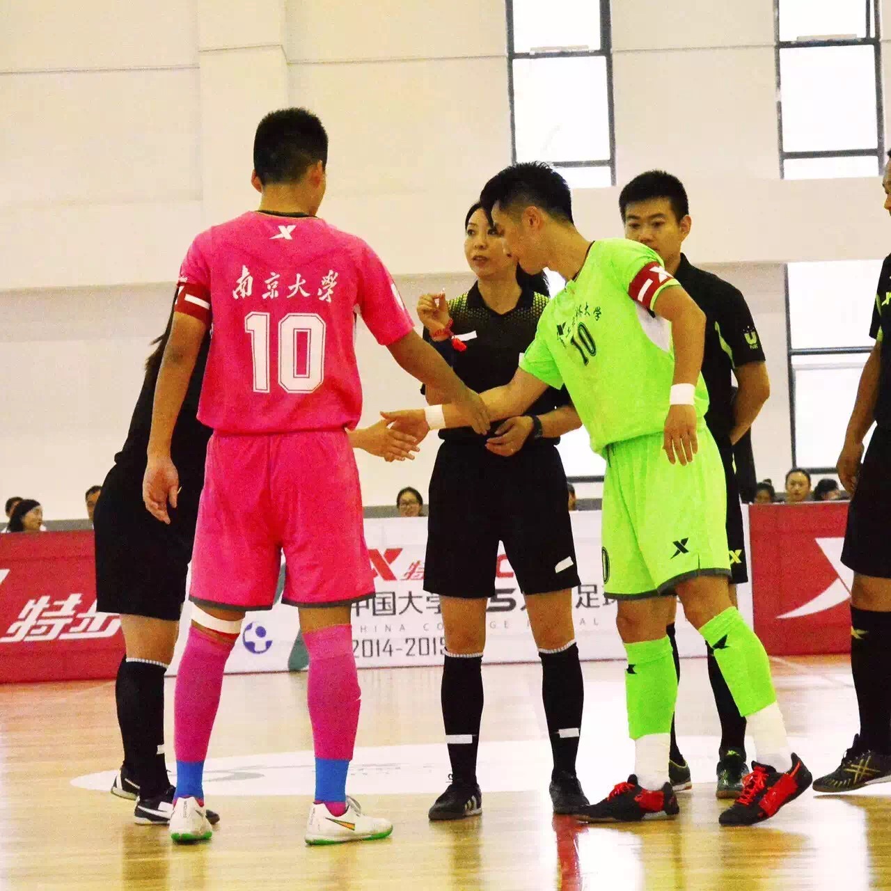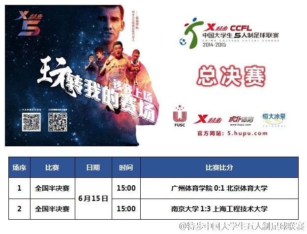 6月15日下午,2014-2015特步大学生五人制足球联赛总决赛第一轮比赛在南京大学举行,对阵双方为北大区亚军南京大学和我校。比赛以我校3:1战胜南京大学告终,我校运动员顶住了南京大学的主场优势,顽强拼搏取得了第一轮客场的关键胜利。接下来,6月18日15:00在我校松江校区体育馆将迎来总决赛第二轮我校主场对阵南京大学的比赛,欢迎广大师生到体育馆观看比赛。