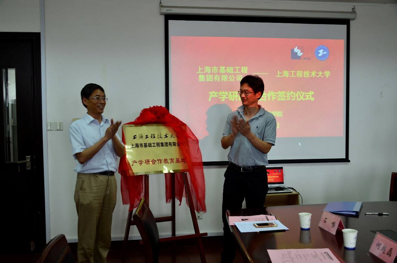 签约仪式之前,双方参会人员分别就各自单位的情况进行了介绍,随后就学生培养、平台建设、教育培训、产品研发、科研项目合作、研究生联合培养、产学合作教育、大学生就业等方面进行了自由交流。上海市基础工程集团有限公司副总裁、设计研究院院长李耀良和城市轨道交通学院院长柴晓冬代表双方分别在《产学研合作框架协议》《产学合作教育基地协议》上签字。李耀良副总裁和城市轨道交通学院党总支书记刘牧众为产学研合作教育基地揭牌。签约仪式后李耀良副总裁一行参观了我校轨道交通工程实验室。