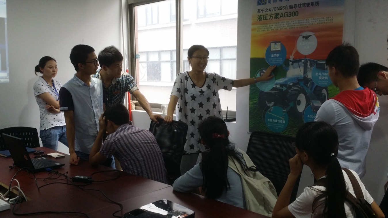 在技术研发部,硬件设计部工程师介绍了部门的主要工作、工作流程、接收机的基本组成和硬件构架;软件设计部介绍了接收机软件的基本组成、工作原理、软件流程,针对同学们的提问,介绍了软件开发平台和开发语言。在生产制造部,部门负责人介绍了测试工作在整个接收机制造过程中的重要作用,介绍了板卡、接收机测试工作的基本要求、主要流程、主要仪器设备和测试软件。在精准农业部,司南导航工程师介绍了卫星导航定位在精准农业的应用,基于GNSS的农业机械自动导航驾驶的基本原理,以及基于北斗卫星导航定位的农机自动作业在我国新疆、黑龙江等地农场的典型应用,针对同学们的提问,介绍了卫星导航和农机自动驾驶控制之间的关系。