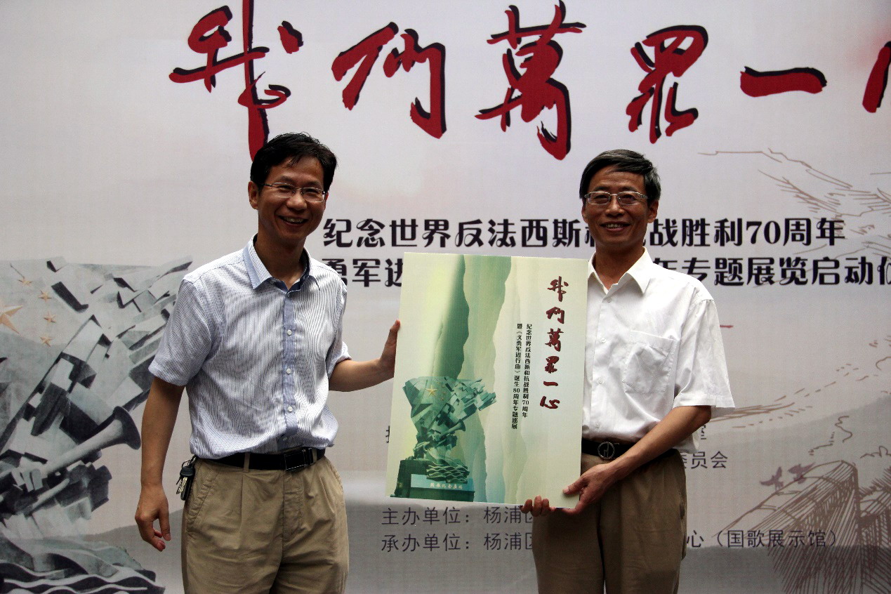 6月30日上午,“我们万众一心”— 纪念世界反法西斯和抗战胜利70周年暨《义勇军进行曲》诞生80周年专题展在国歌展示馆揭幕。据悉,展览在国歌展示馆首展后,将在全国范围内巡展,而上海市高校巡展的首站将在我校启动。杨浦区文化局党委副书记、区文联副主席陈红光书记向城市轨道交通学院党总支刘牧众书记赠巡展标牌。