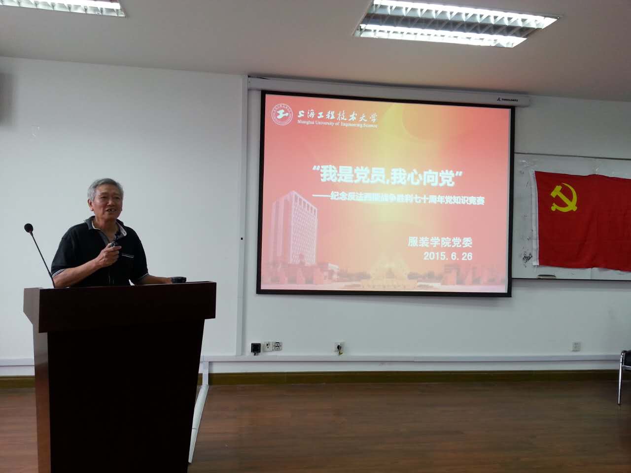 今年是反法西斯战争胜利七十周年,为引导广大青年了解党史党章,了解历史,进一步促进党员深入学习党务知识,保持创先争优意识,6月26日下午服装学院党委在艺术楼A215举办纪念反法西斯战争胜利七十周年“我是党员,我心向党”为主题的知识竞赛。出席本次活动的有服装学院二级关工委副主任、特邀组织员张海成,服装学院组织员郑艳以及全体研究生党员、积极分子。