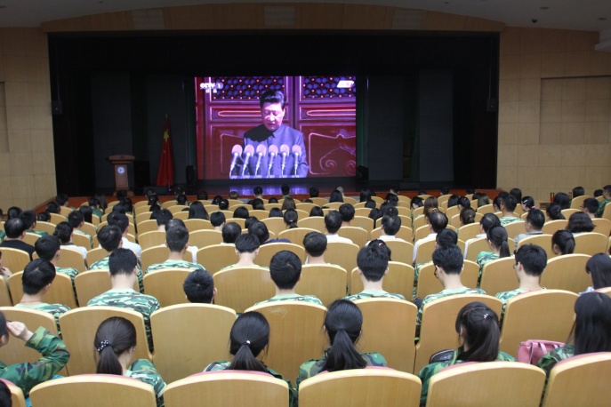 9月3日是中国人民抗日战争暨世界反法西斯战争胜利70周年,这一天,上海工程技术大学高职学院581名大一新生聚集在师生活动中心观看纪念大会的直播。