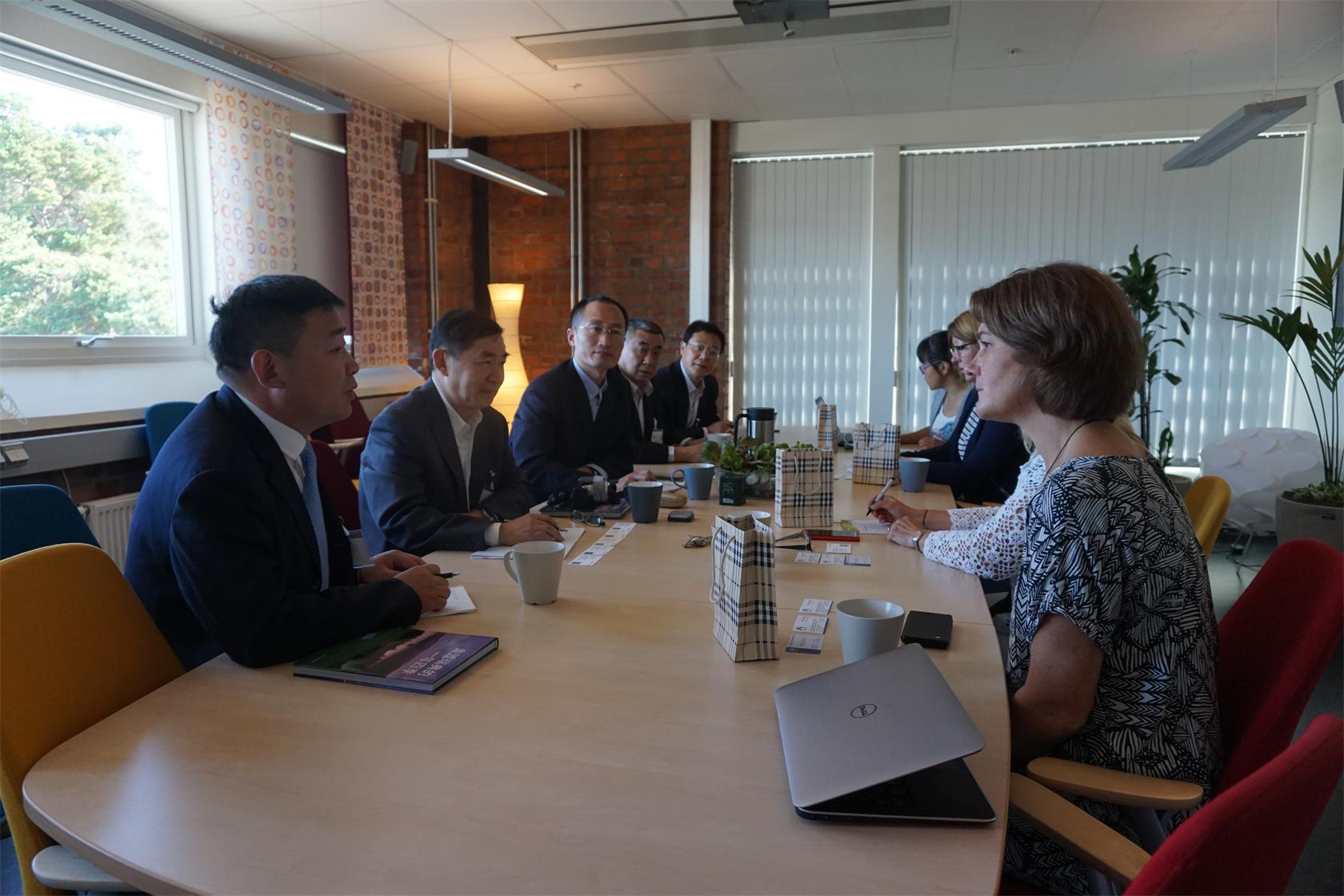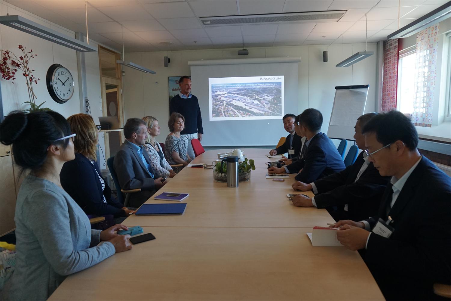 访问团实地考察了Innovatum科技园内孵化器的硬件服务设施,详细了解了孵化器的创新服务体系,走访了孵化企业,听取了项目介绍。科技园国际合作部主管Lillemor Lindbreg女士详细介绍了近年园区内比较成功的项目,包括海洋石油提取清洁能源项目、海底风能项目、可再生服装面料项目、手机电量监测项目、交通工具轻量化项目等。目前园区有40多个来自各国企业、研究机构的合作伙伴开展项目的联合攻关,其中包括2所大学和7个研究机构。科技园介绍的以企业为主体,园区、企业、高校紧密互动,共谋发展的“三螺旋”合作模式令人印象深刻。