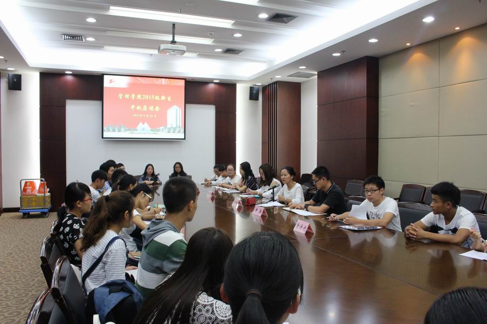 2015级有702名新同学刚刚加入管理学院的大集体,为了了解新生同学们的具体情况,加强学院与同学们的交流,管理学院于9月25日下午在图文信息中心第五报告厅举行了新生交流会,会上管理学院党委范君晖副书记,学生办公室牛兵主任、一年级辅导员金佳雯、童为光及白茹老师、2015级各专业新生代表们共同畅谈了校园生活的方方面面。