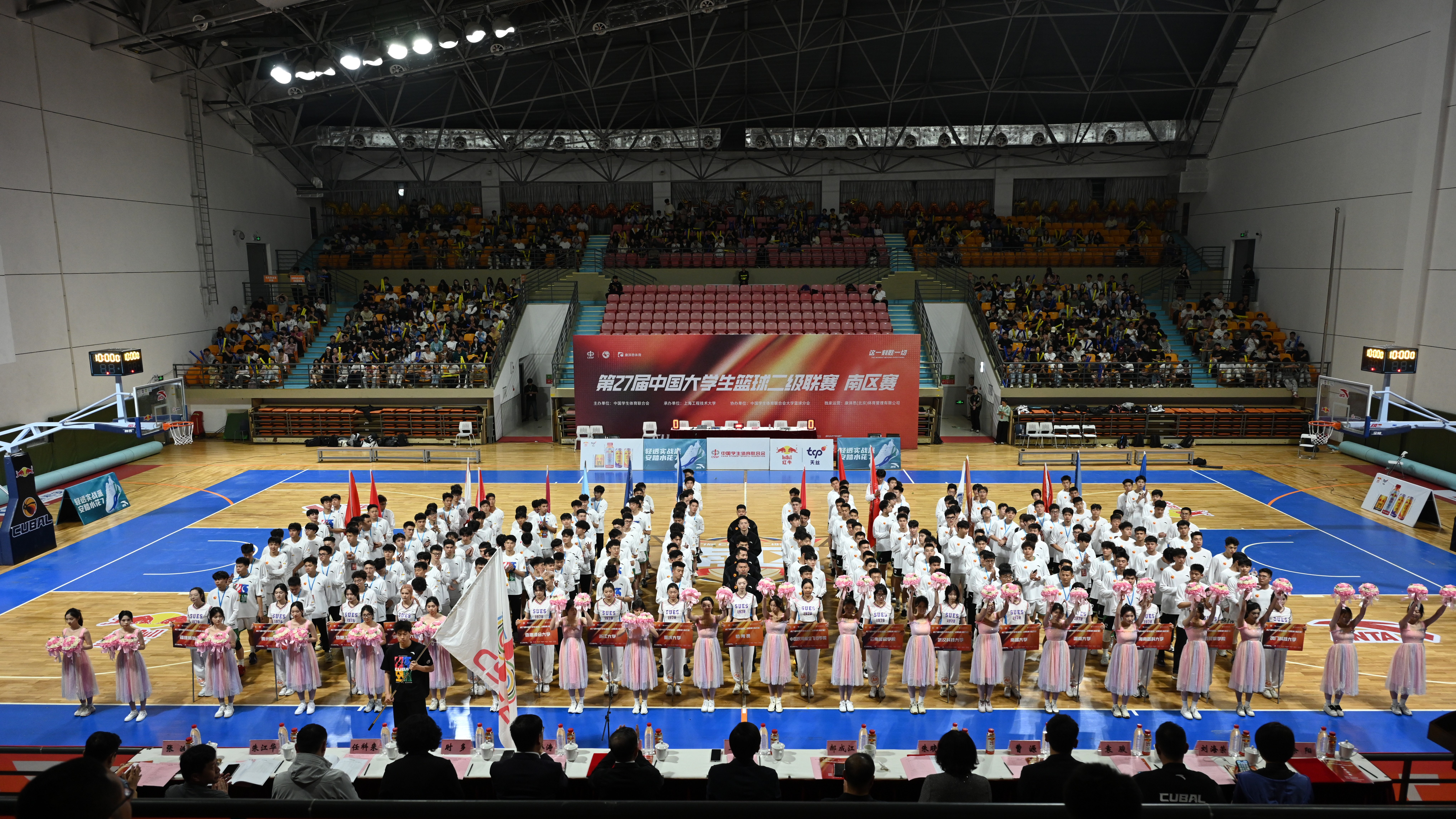 王浩为揭幕战开球。薛明扬宣布第27届中国大学生篮球二级联赛(南赛区)开赛。