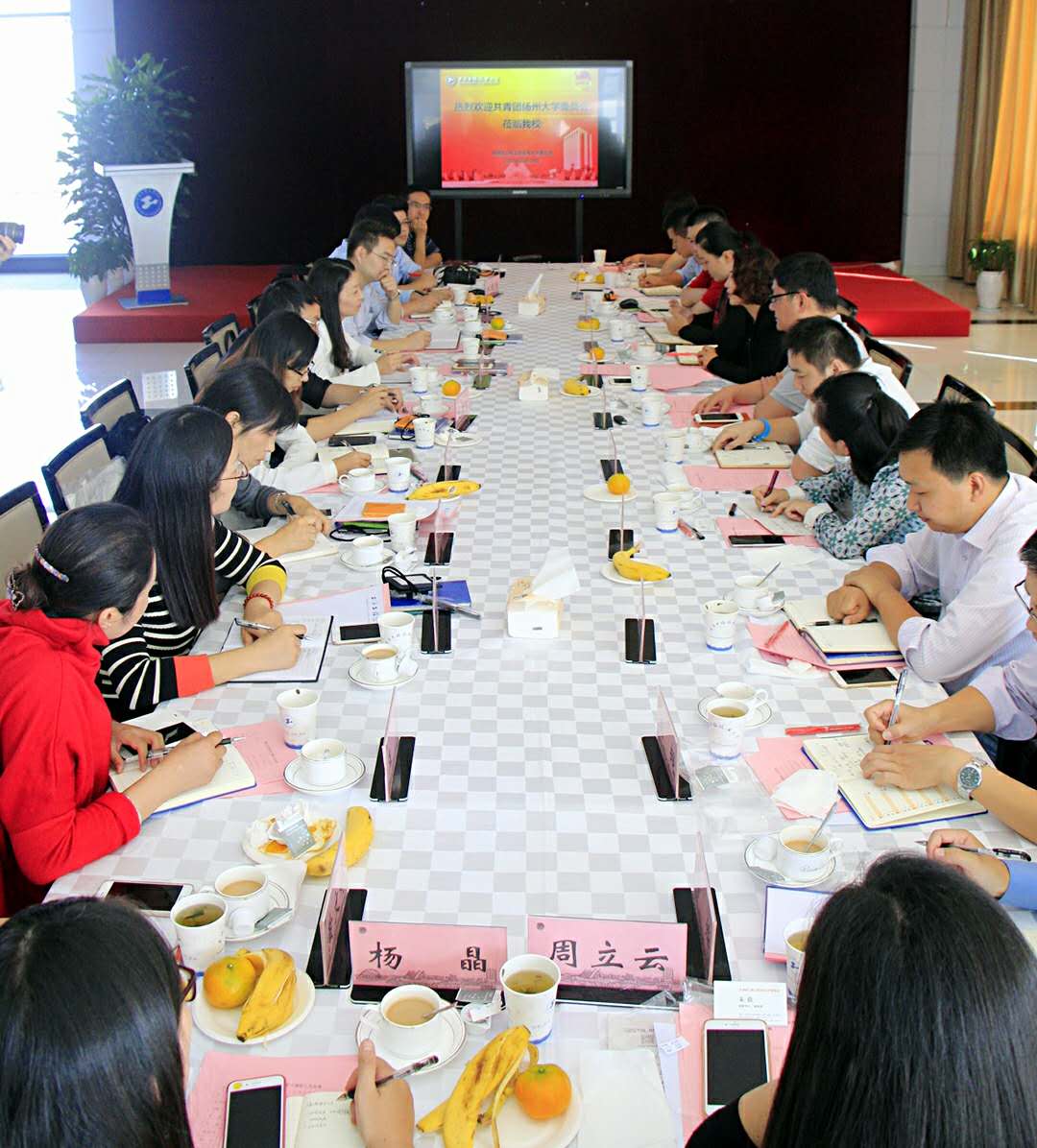 在行政楼大厅沙盘前,朱蓓书记对扬州大学团委来客表示热烈欢迎,并介绍了学校的历史变迁和松江校区的整体发展。在交流会上,来访客人通过学校宣传片了解了工程大的办学理念和办学特色。随后,朱蓓书记详细介绍了工程大共青团工作的基本情况和品牌项目。朱蓓书记表示,扬州大学共青团在创新创业教育、艺术教育等领域不仅走在江苏省前列,一些特色做法更是在全国高校共青团中独树一帜,希望以此次交流为契机,促进双方共青团资源共享、互学成长。扬州大学团委书记徐蕾对工程大共青团的热情接待表示感谢,期待两校共青团在未来能有更多交流合作,实现共赢。随后,两校团干部围绕“大学生创新创业”、“新媒体平台建设”、“艺术教育建设”等议题展开交流,交换工作心得。长期以来,扬州大学在“挑战杯”赛事上收获颇丰。会上,扬大团委重点介绍了“挑战杯”的特色做法,同时,对我校领导力建设、新媒体建设、科学商店等品牌工作也给予了肯定。