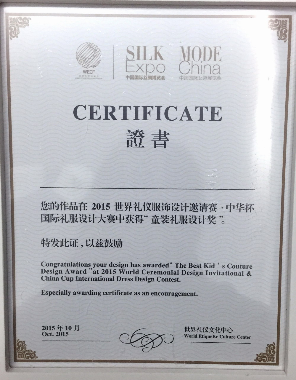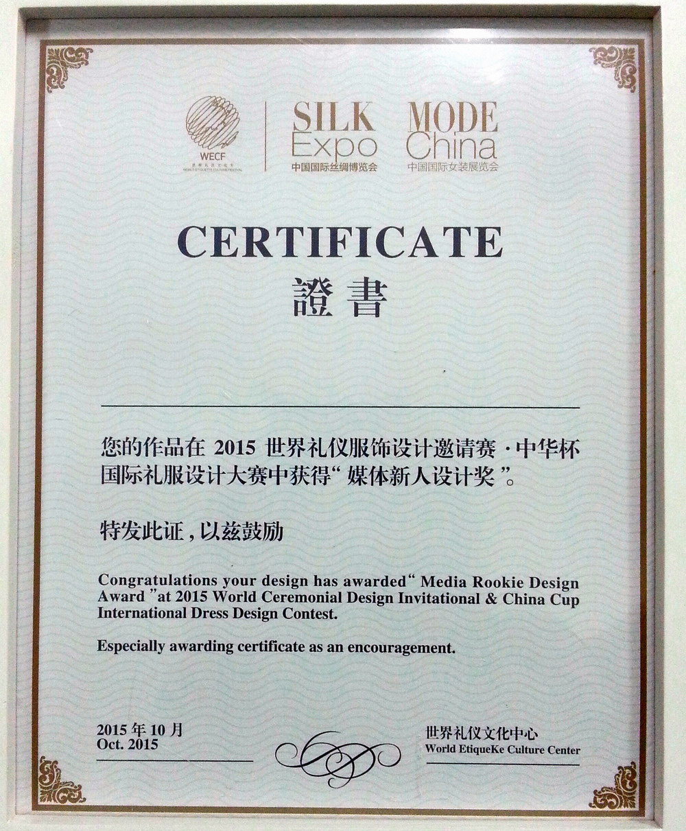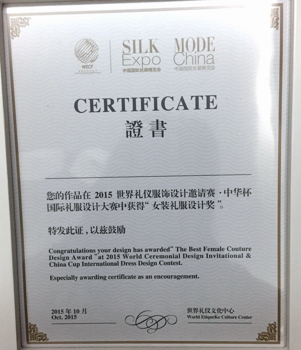 “中华杯”国际服装设计大赛是我国首批认定的国家级、国际性赛事。此次大赛的主题为“ 荣光重启,时尚丝路 ”,服装学院积极组织,鼓励学生多参与各项国际服装赛事,发掘更多的设计新秀,培养服装人才。经过激烈的角逐中,服装学院学生陆昳雯获“2015中华杯国际礼服设计大赛女装礼服设计奖”和“2015中华杯国际礼服设计大赛童装礼服设计奖”;学生朱晶获“2015中华杯国际礼服设计大赛媒体新人设计奖”。