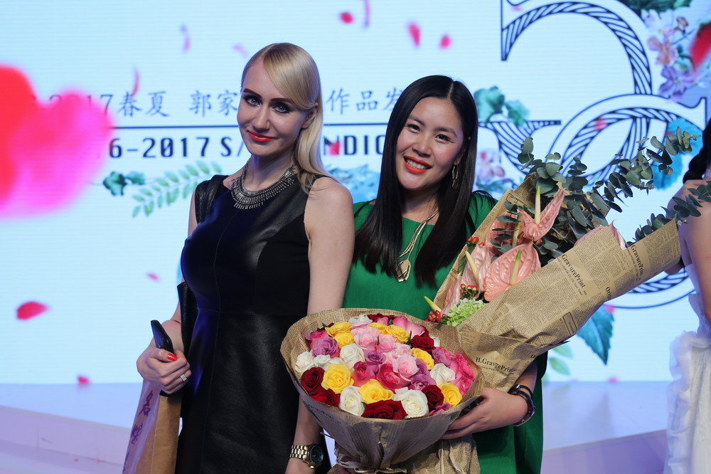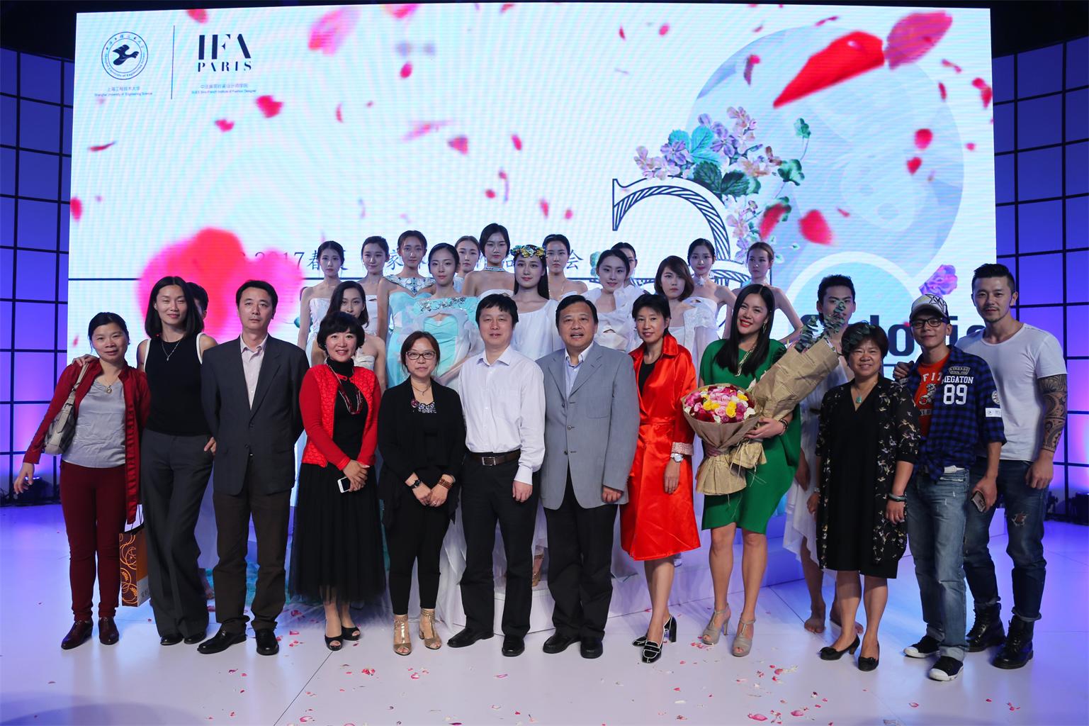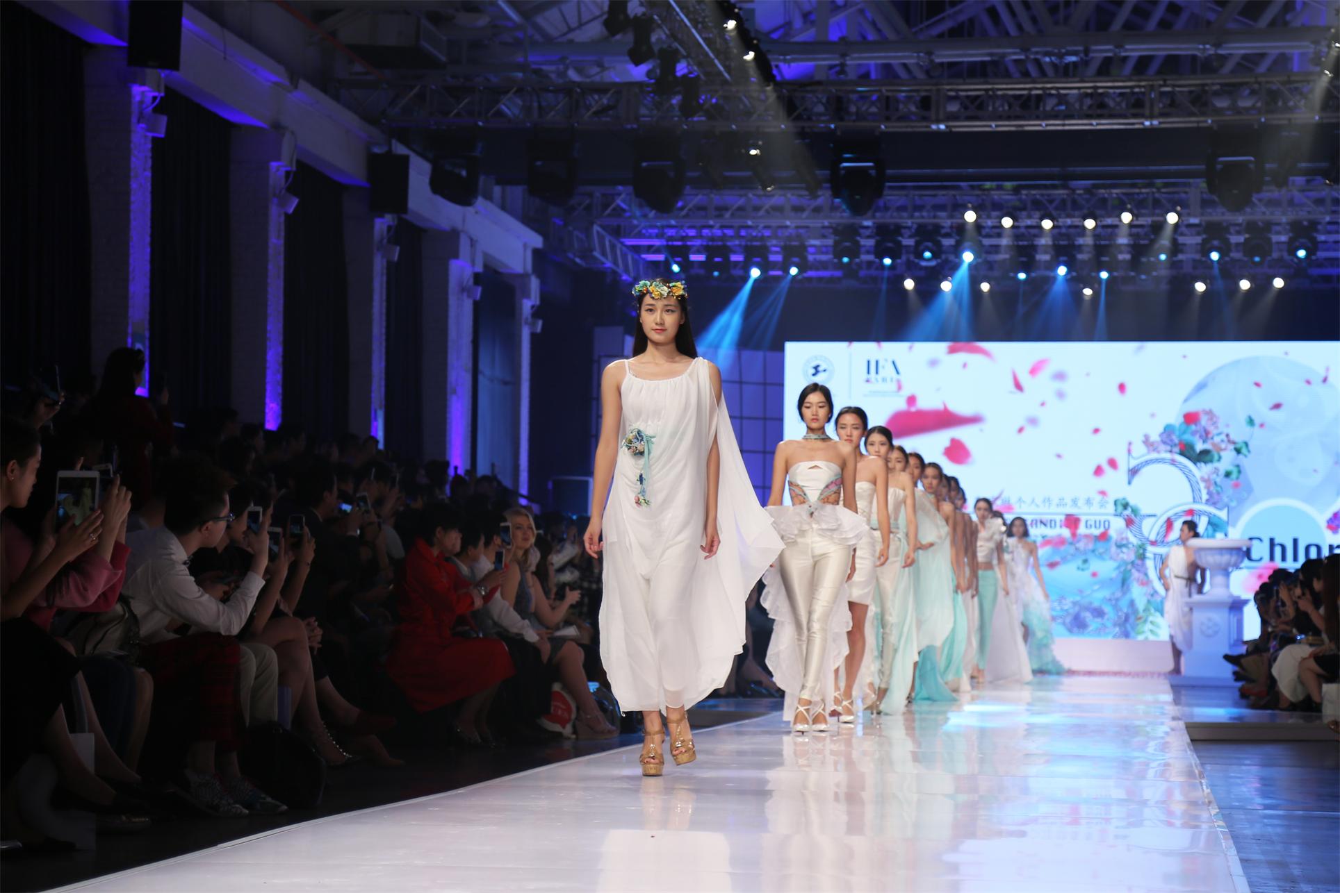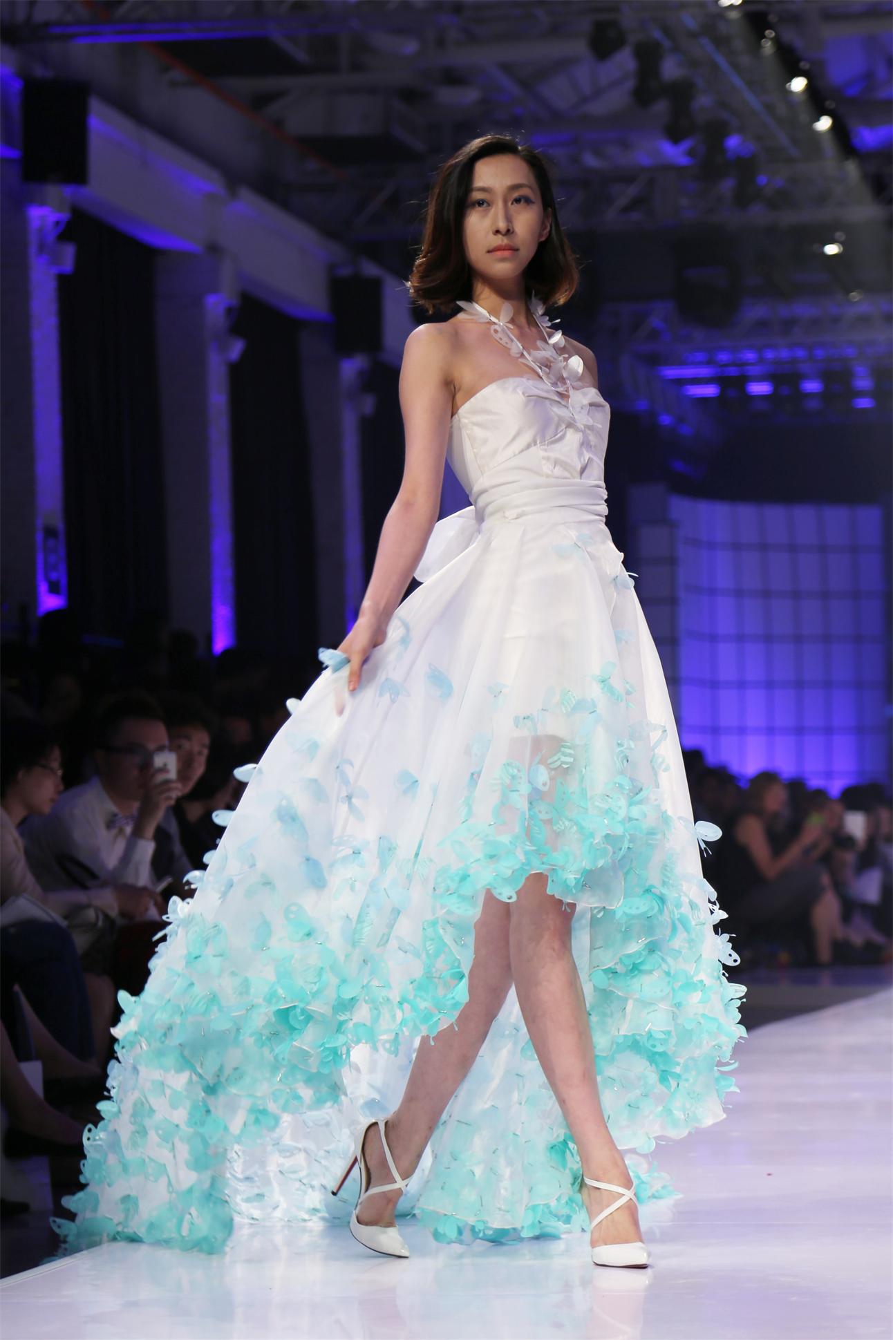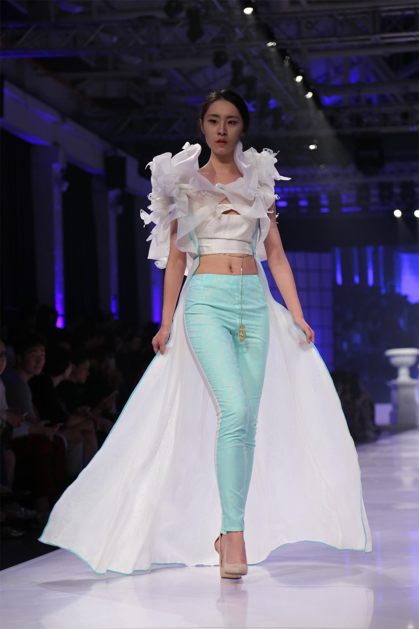白昼萦回绿水,夜晚朦胧皎白,整场服装融为实穿性的日装系列,以及柔美飘逸的晚装系列,同时巧妙穿插春夏流行趋势,主要运用雪纺、蕾丝、欧根纱等轻薄飘逸的材质,辅以大量的手工钉珠工艺,营造了一种灵动活泼、潇洒诗意、心神愉悦的美之意境。